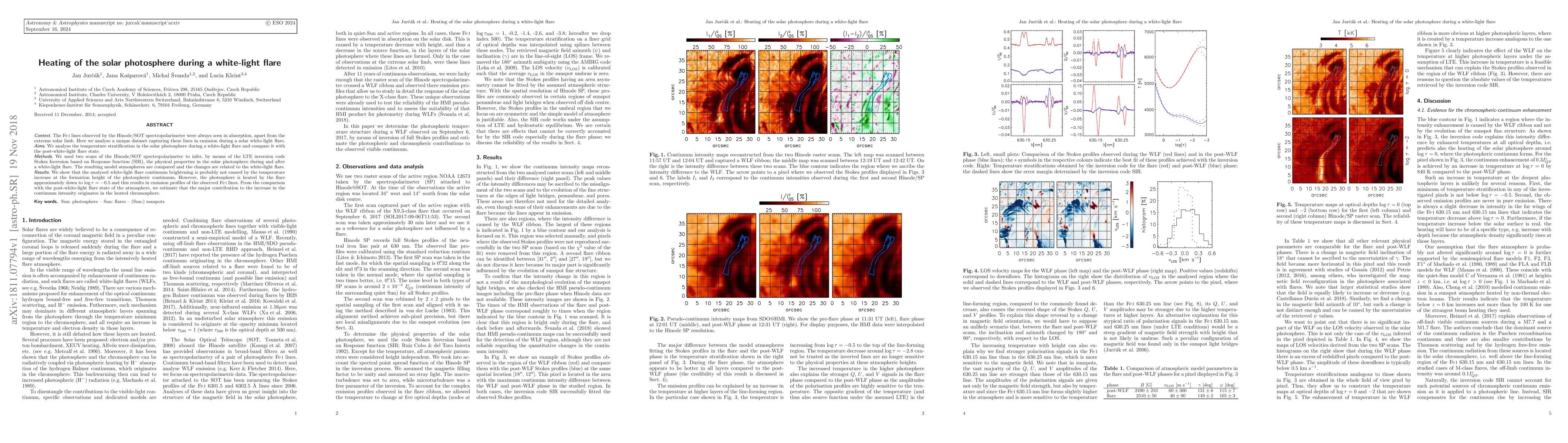 The \ion{Fe}{i} lines observed by the Hinode/SOT spectropolarimeter were always seen in absorption, apart from the extreme solar limb. Here we analyse a unique dataset capturing these lines in emission during a solar white-light flare. We analyse the temperature stratification in the solar photosphere during a white-light flare and compare it with the post-white-light flare state. We used two scans of the Hinode/SOT spectropolarimeter to infer, by means of the LTE inversion code Stokes Inversion based on Response function (SIR), the physical properties in the solar photosphere during and after a white-light flare. The resulting model atmospheres are compared and the changes are related to the white-light flare. We show that the analysed white-light flare continuum brightening is probably not caused by the temperature increase at the formation height of the photospheric continuum. However, the photosphere is heated by the flare approximately down to $\log \tau = -0.5$ and this results in emission profiles of the observed \ion{Fe}{i} lines. From the comparison with the post-white-light flare state of the atmosphere, we estimate that the major contribution to the increase in the continuum intensity originates in the heated chromosphere.