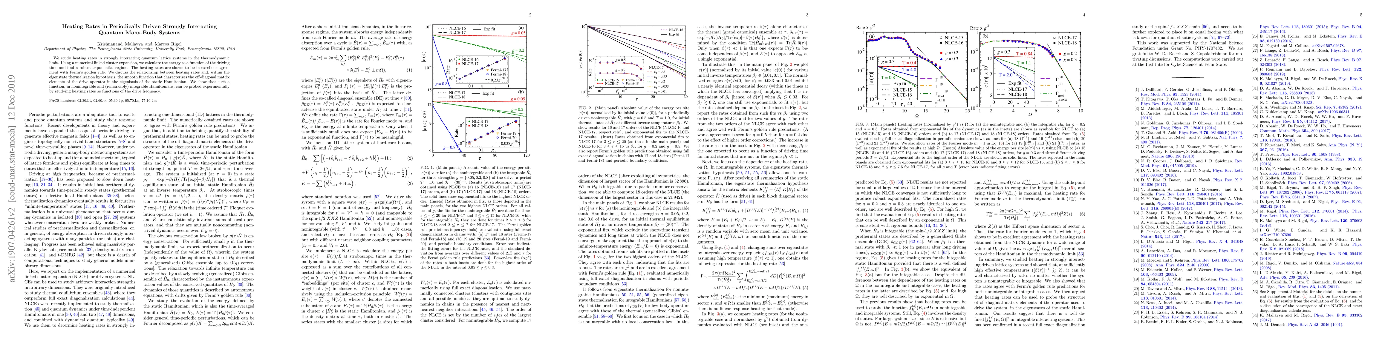 This paper investigates heating rates in strongly interacting quantum lattice systems under periodic driving, revealing an exponential heating regime consistent with Fermi's golden rule. It connects these heating rates to the eigenstate thermalization hypothesis and suggests experimental probing of the drive frequency's effect on heating rates.