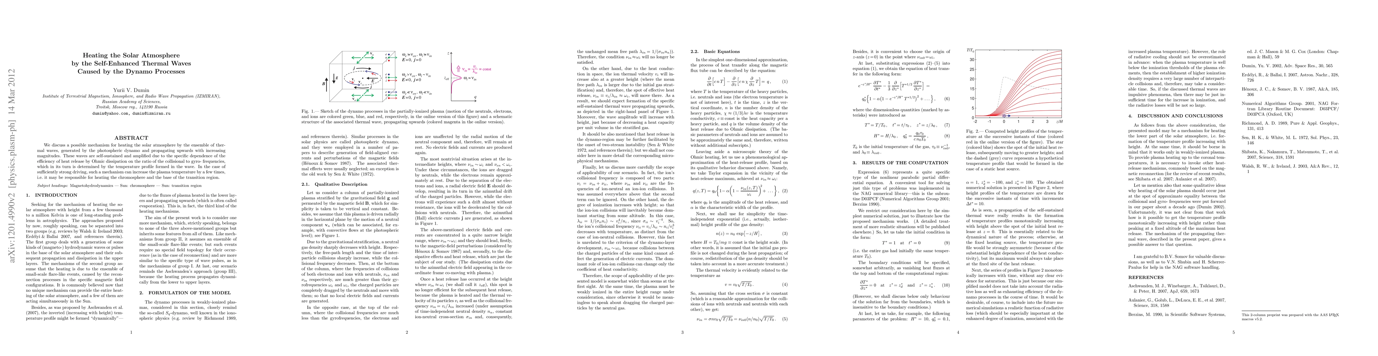 We discuss a possible mechanism for heating the solar atmosphere by the ensemble of thermal waves, generated by the photospheric dynamo and propagating upwards with increasing magnitudes. These waves are self-sustained and amplified due to the specific dependence of the efficiency of heat release by Ohmic dissipation on the ratio of the collisional to gyro- frequencies, which in its turn is determined by the temperature profile formed in the wave. In the case of sufficiently strong driving, such a mechanism can increase the plasma temperature by a few times, i.e. it may be responsible for heating the chromosphere and the base of the transition region.