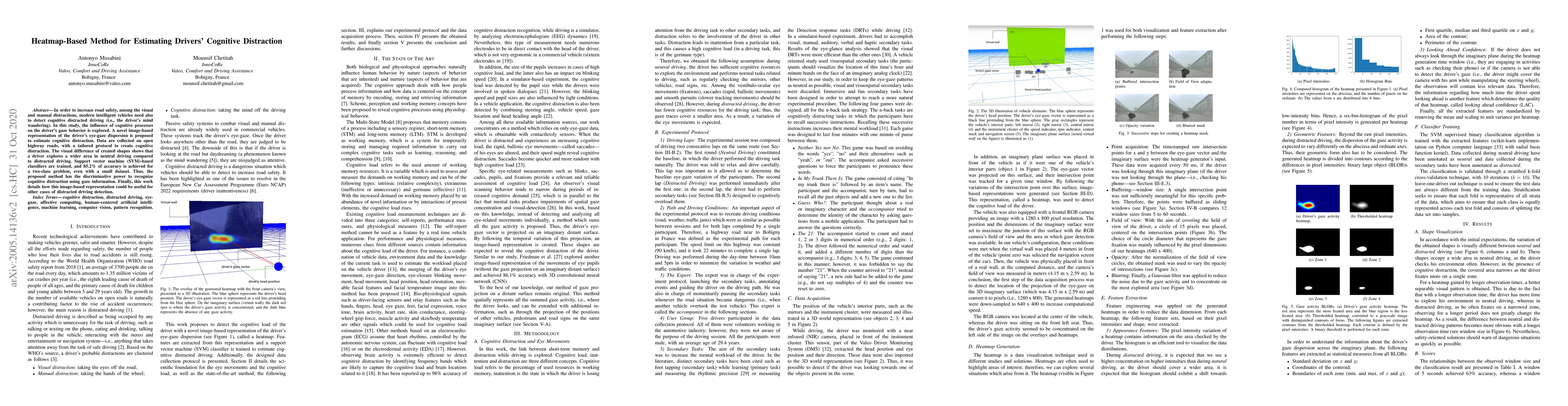 In order to increase road safety, among the visual and manual distractions, modern intelligent vehicles need also to detect cognitive distracted driving (i.e., the drivers mind wandering). In this study, the influence of cognitive processes on the drivers gaze behavior is explored. A novel image-based representation of the driver's eye-gaze dispersion is proposed to estimate cognitive distraction. Data are collected on open highway roads, with a tailored protocol to create cognitive distraction. The visual difference of created shapes shows that a driver explores a wider area in neutral driving compared to distracted driving. Thus, support vector machine (SVM)-based classifiers are trained, and 85.2% of accuracy is achieved for a two-class problem, even with a small dataset. Thus, the proposed method has the discriminative power to recognize cognitive distraction using gaze information. Finally, this work details how this image-based representation could be useful for other cases of distracted driving detection.