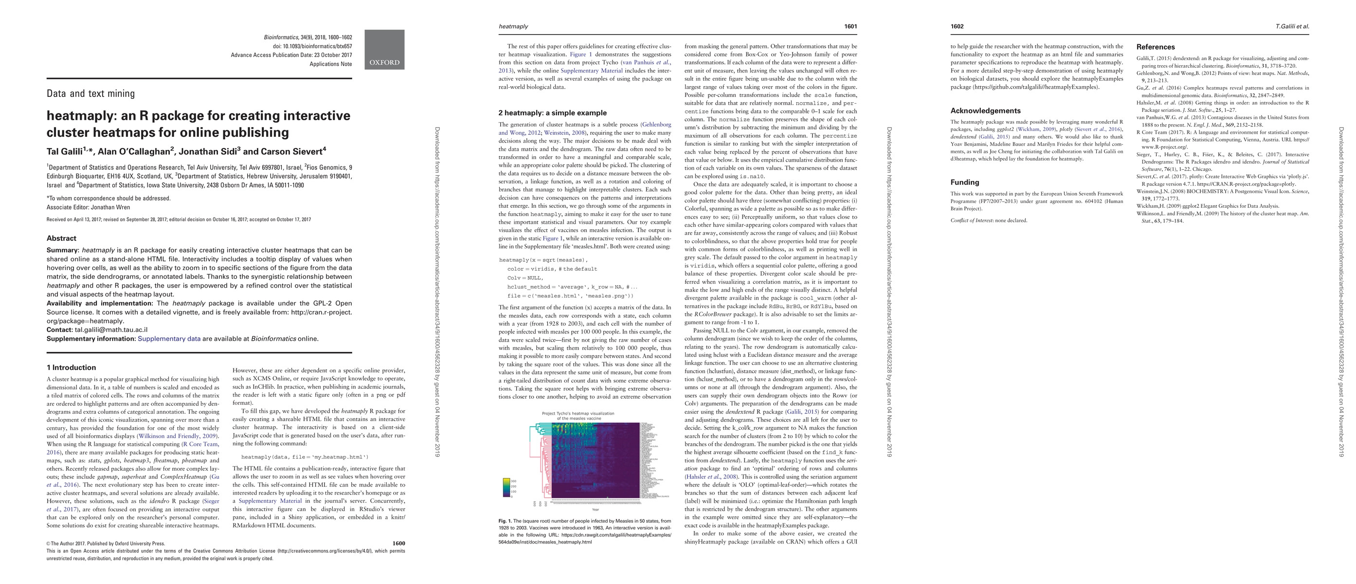Summary: heatmaply is an R package that facilitates the creation of interactive, shareable cluster heatmaps in HTML, with features like tooltips and zoom functionality, enhancing statistical and visual control. It is freely available under the GPL-2 license with comprehensive documentation.