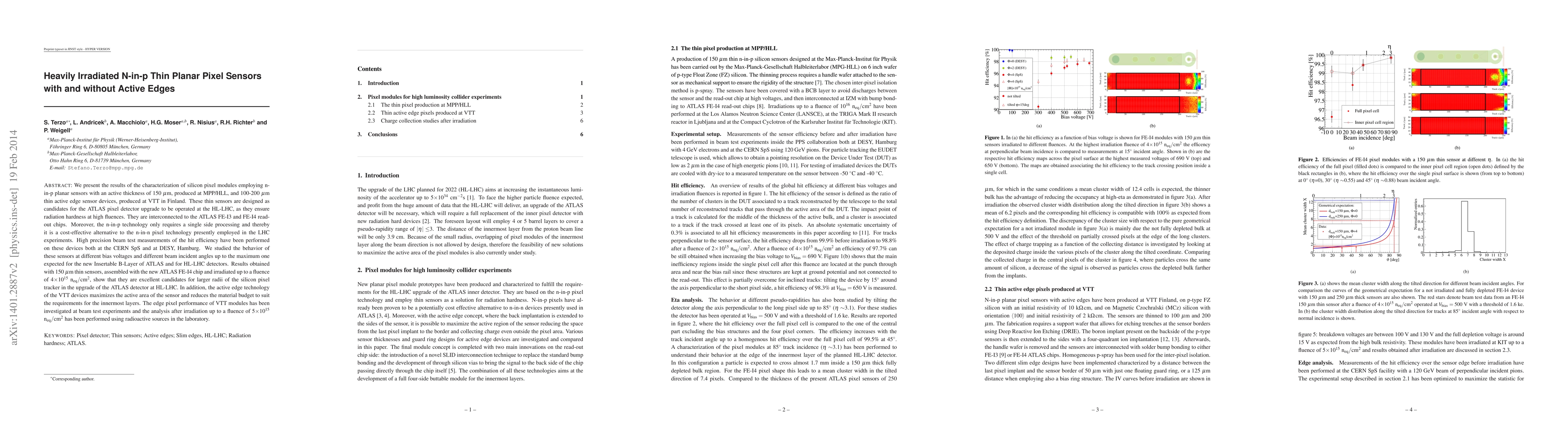 We present the results of the characterization of silicon pixel modules employing n-in-p planar sensors with an active thickness of 150 $\mathrm{\mu}$m, produced at MPP/HLL, and 100-200 $\mathrm{\mu}$m thin active edge sensor devices, produced at VTT in Finland. These thin sensors are designed as candidates for the ATLAS pixel detector upgrade to be operated at the HL-LHC, as they ensure radiation hardness at high fluences. They are interconnected to the ATLAS FE-I3 and FE-I4 read-out chips. Moreover, the n-in-p technology only requires a single side processing and thereby it is a cost-effective alternative to the n-in-n pixel technology presently employed in the LHC experiments. High precision beam test measurements of the hit efficiency have been performed on these devices both at the CERN SpS and at DESY, Hamburg. We studied the behavior of these sensors at different bias voltages and different beam incident angles up to the maximum one expected for the new Insertable B-Layer of ATLAS and for HL-LHC detectors. Results obtained with 150 $\mathrm{\mu}$m thin sensors, assembled with the new ATLAS FE-I4 chip and irradiated up to a fluence of 4$\times$10$^{15}\mathrm{n}_{\mathrm{eq}}/\mathrm{cm}^2$, show that they are excellent candidates for larger radii of the silicon pixel tracker in the upgrade of the ATLAS detector at HL-LHC. In addition, the active edge technology of the VTT devices maximizes the active area of the sensor and reduces the material budget to suit the requirements for the innermost layers. The edge pixel performance of VTT modules has been investigated at beam test experiments and the analysis after irradiation up to a fluence of 5$\times$10$^{15}\mathrm{n}_{\mathrm{eq}}/\mathrm{cm}^2$ has been performed using radioactive sources in the laboratory.