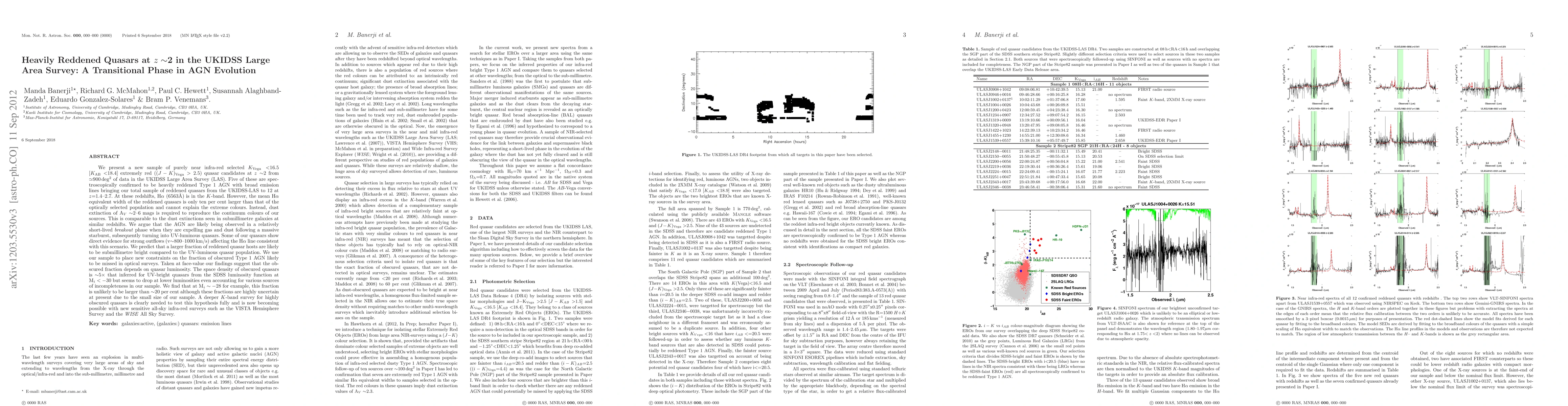 This paper identifies a new sample of heavily reddened quasars at z~2 from the UKIDSS LAS, confirming five as Type 1 AGN with significant dust extinction. The study suggests these quasars are in a transitional phase following a starburst, with predictions that a larger fraction of these quasars will be submillimetre bright. The findings indicate a higher space density of obscured quasars compared to UV-bright quasars.