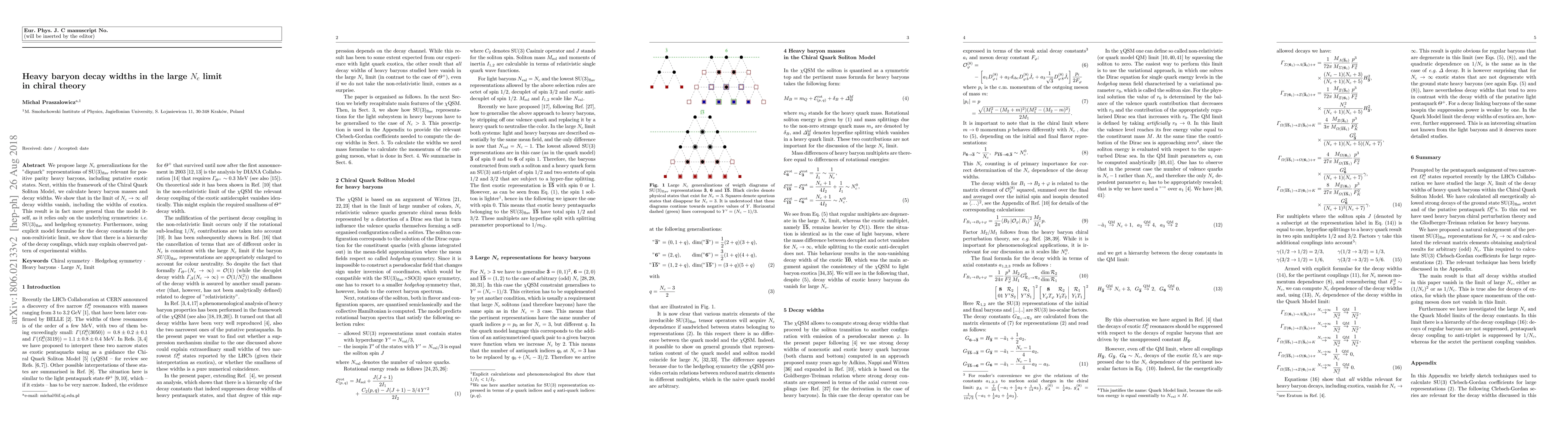 We propose large $N_c$ generalizations for the "diquark" representations of SU(3)$_{\rm flav}$ relevant for positive parity heavy baryons, including putative exotic states. Next, within the framework of the Chiral Quark Soliton Model, we calculate heavy baryon masses and decay widths. We show that in the limit of $N_c \rightarrow \infty$ {\em all} decay widths vanish, including the widths of exotica. This result is in fact more general than the model itself, as it relies only on the underlying symmetries: i.e. SU(3)$_{\rm flav}$ and hedgehog symmetry. Furthermore, using explicit model formulae for the decay constants in the non-realtivistic limit, we show that there is a hierarchy of the decay couplings, which may explain observed pattern of experimental widths.