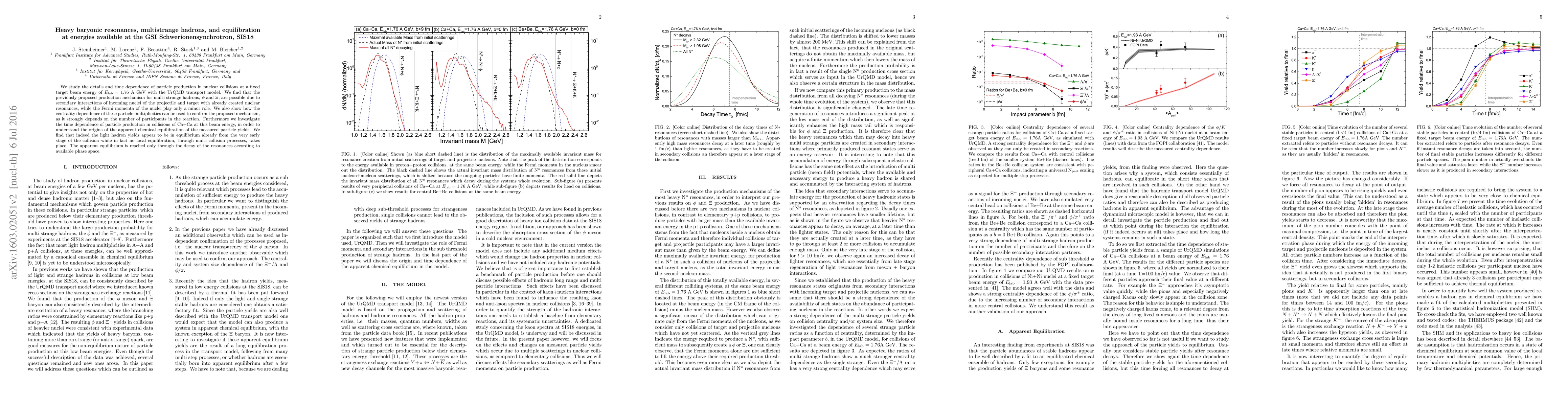 This paper uses the UrQMD transport model to study particle production in nuclear collisions at 1.76 A GeV, finding that secondary interactions with nuclear resonances, not Fermi momenta, produce multistrange hadrons. It also reveals that light hadron yields appear to be in chemical equilibrium early in the collision due to resonance decay, rather than local equilibration.