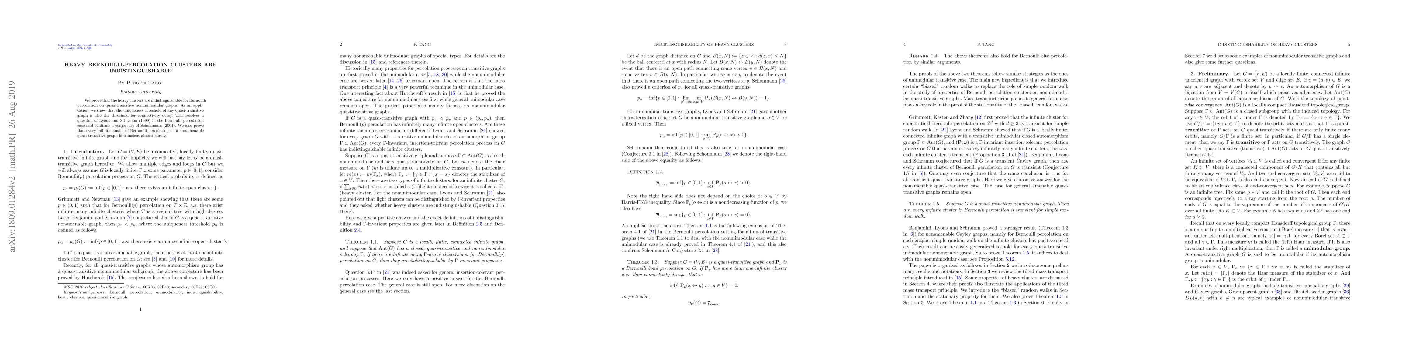We prove that the heavy clusters are indistinguishable for Bernoulli percolation on quasi-transitive nonunimodular graphs. As an application, we show that the uniqueness threshold of any quasi-transitive graph is also the threshold for connectivity decay. This resolves a question of Lyons and Schramm (1999) in the Bernoulli percolation case and confirms a conjecture of Schonmann (2001). We also prove that every infinite cluster of Bernoulli percolation on a nonamenable quasi-transitive graph is transient almost surely.