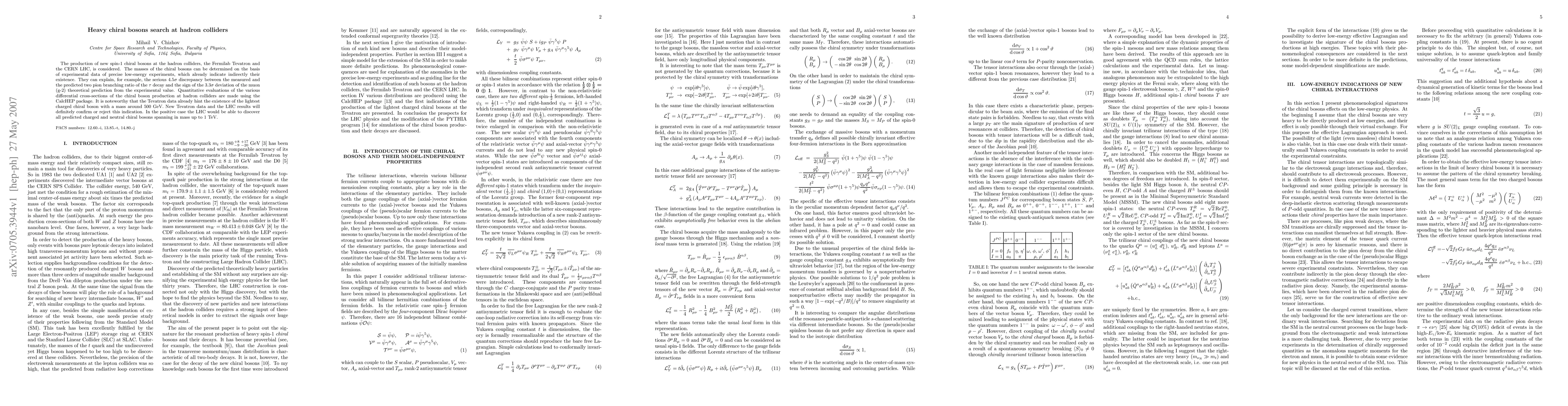 The production of new spin-1 chiral bosons at the hadron colliders, the Fermilab Tevatron and the CERN LHC, is considered. The masses of the chiral bosons can be determined on the basis of experimental data of precise low-energy experiments, which already indicate indirectly their existence. They can explain, for example, the serious 4.5 sigma discrepancy between the measured and the predicted two pion branching ratio of the tau decay and the sign of the 3.3 sigma deviation of the muon (g-2) theoretical prediction from the experimental value. Quantitative evaluations of the various differential cross-sections of the chiral boson production at hadron colliders are made using the CalcHEP package. It is noteworthy that the Tevatron data already hint the existence of the lightest charged chiral boson with a mass around 500 GeV. New Tevatron data and the LHC results will definitely confirm or reject this indication. In the positive case the LHC would be able to discover all predicted charged and neutral chiral bosons spanning in mass up to 1 TeV.