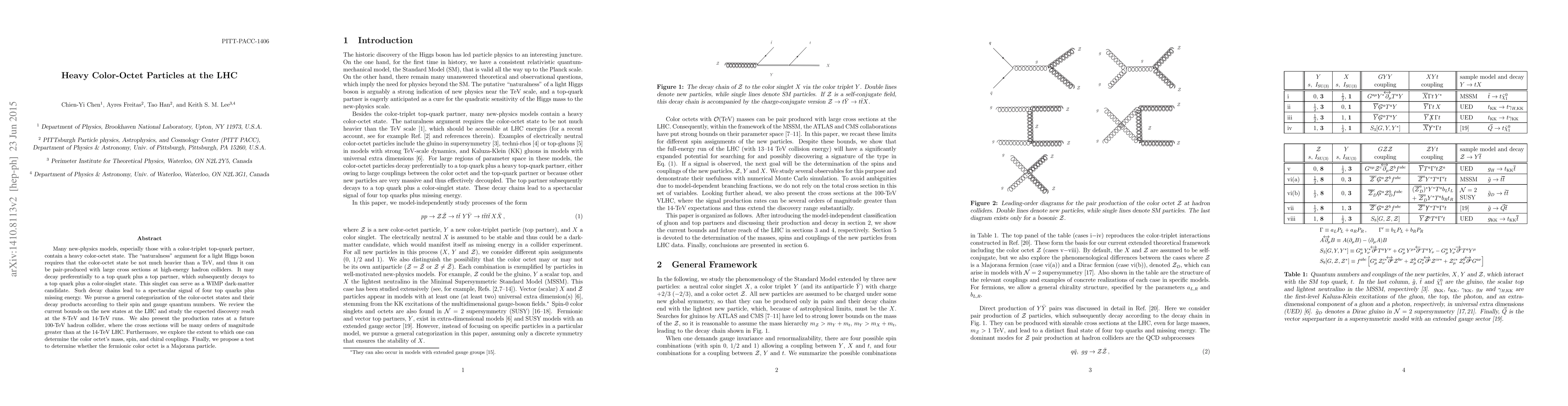 This paper investigates heavy color-octet particles in new-physics models, particularly those featuring a color-triplet top-quark partner. It explores their production and decay at the LHC, focusing on signals involving four top quarks and missing energy, and assesses the potential for discovery at current and future collider energies.