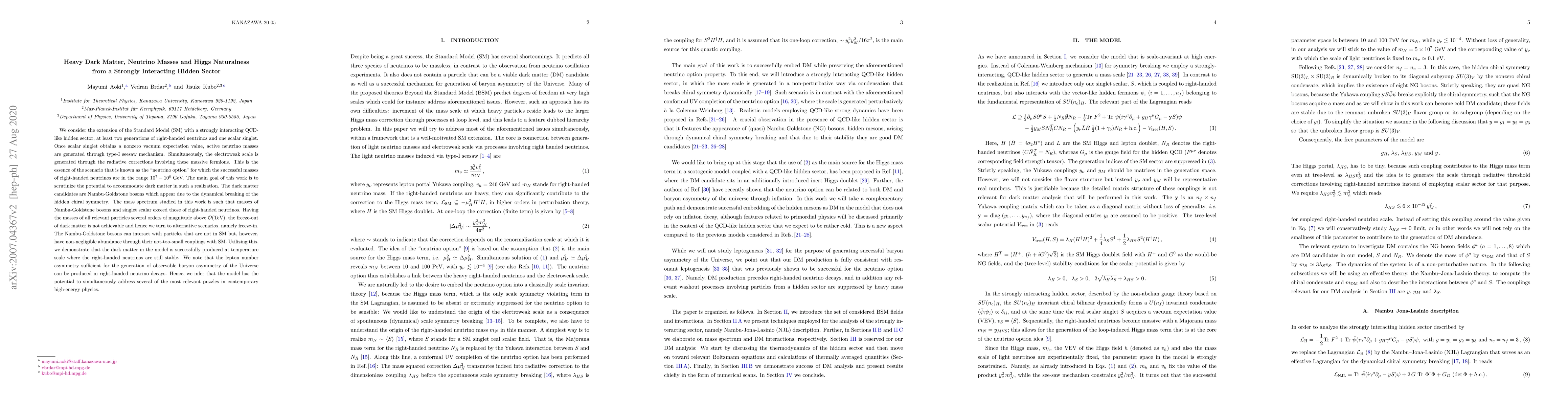This paper explores an extended Standard Model with a strongly interacting hidden sector, right-handed neutrinos, and a scalar singlet, generating neutrino masses via the seesaw mechanism and the electroweak scale through radiative corrections. The model proposes Nambu-Goldstone bosons as heavy dark matter candidates produced via the freeze-in mechanism, addressing dark matter, neutrino masses, and Higgs naturalness.