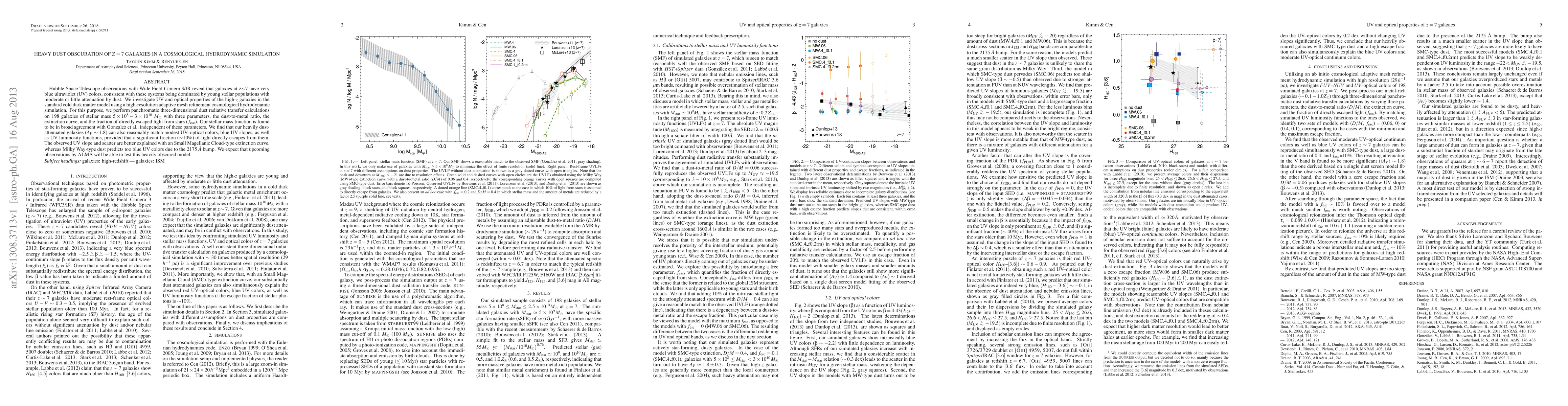 Hubble Space Telescope observations with Wide Field Camera 3/IR reveal that galaxies at z~7 have very blue ultraviolet (UV) colors, consistent with these systems being dominated by young stellar populations with moderate or little attenuation by dust. We investigate UV and optical properties of the high-z galaxies in the standard cold dark matter model using a high-resolution adaptive mesh refinement cosmological hydrodynamic simulation. For this purpose, we perform panchromatic three-dimensional dust radiative transfer calculations on 198 galaxies of stellar mass 5x10^8-3x10^{10} Msun with three parameters, the dust-to-metal ratio, the extinction curve, and the fraction of directly escaped light from stars (\fesc). Our stellar mass function is found to be in broad agreement with Gonzalez et al., independent of these parameters. We find that our heavily dust-attenuated galaxies (A_V~1.8) can also reasonably match modest UV-optical colors, blue UV slopes, as well as UV luminosity functions, provided that a significant fraction (~10%) of light directly escapes from them. The observed UV slope and scatter are better explained with an Small Magellanic Cloud-type extinction curve, whereas Milky Way-type dust predicts too blue UV colors due to the 2175A bump. We expect that upcoming observations by ALMA will be able to test this heavily obscured model.