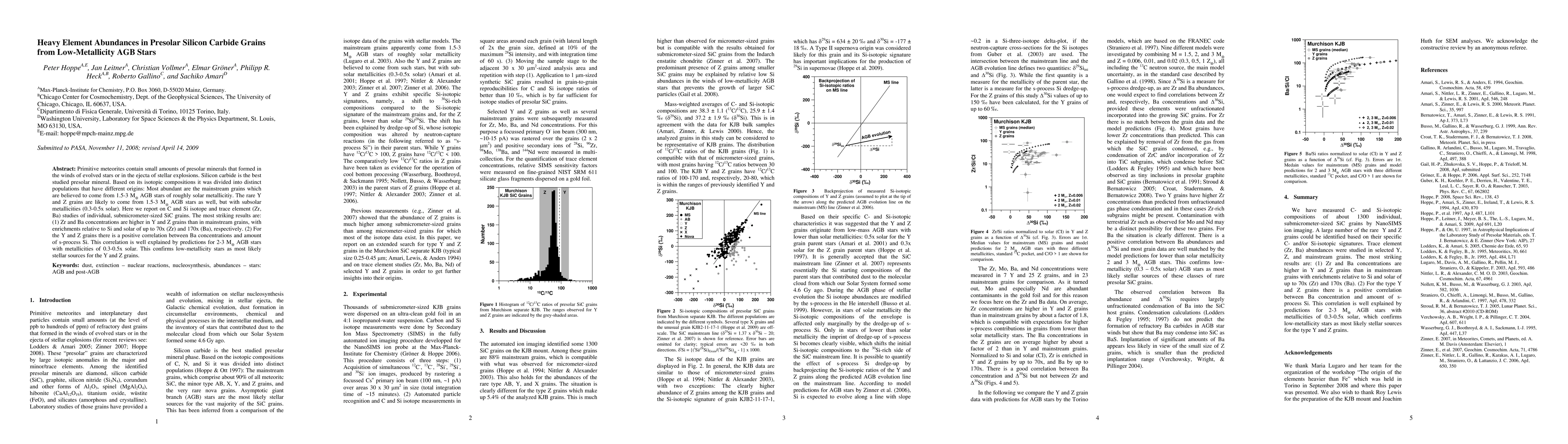 This paper investigates heavy element abundances in presolar silicon carbide grains from low-metallicity asymptotic giant branch (AGB) stars, revealing significant enrichments of Zr and Ba in Y and Z grains compared to mainstream grains. The correlation between Ba concentrations and s-process Si in Y and Z grains supports the origin of these grains from low-metallicity AGB stars.