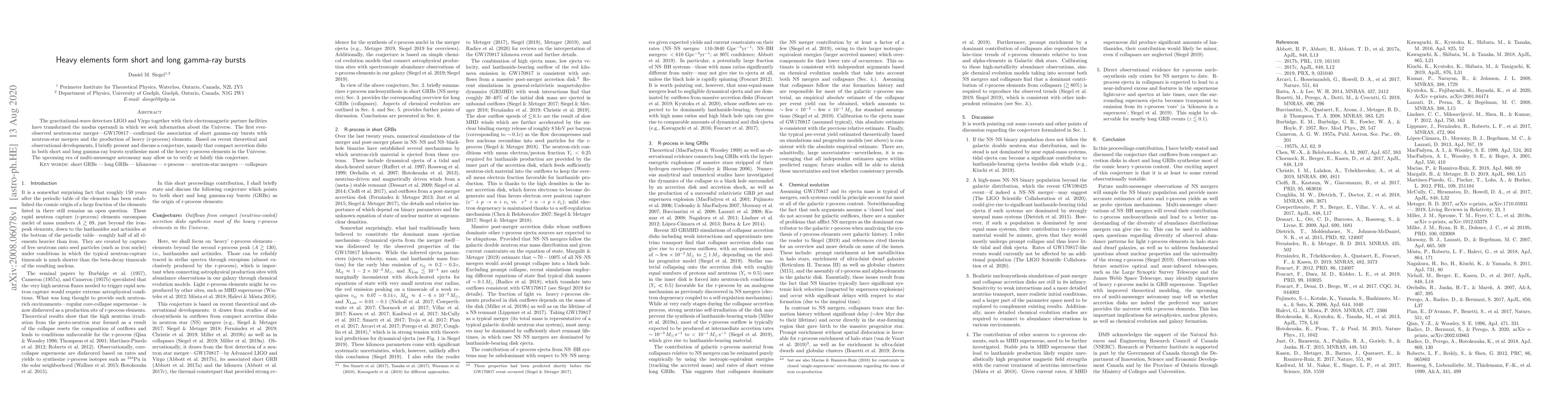 The first observed neutron-star merger confirmed short gamma-ray bursts' association with neutron-star mergers and heavy element production. A conjecture suggests that compact accretion disks in both short and long gamma-ray bursts synthesize most of the Universe's heavy r-process elements, potentially verifiable through the era of multi-messenger astronomy.