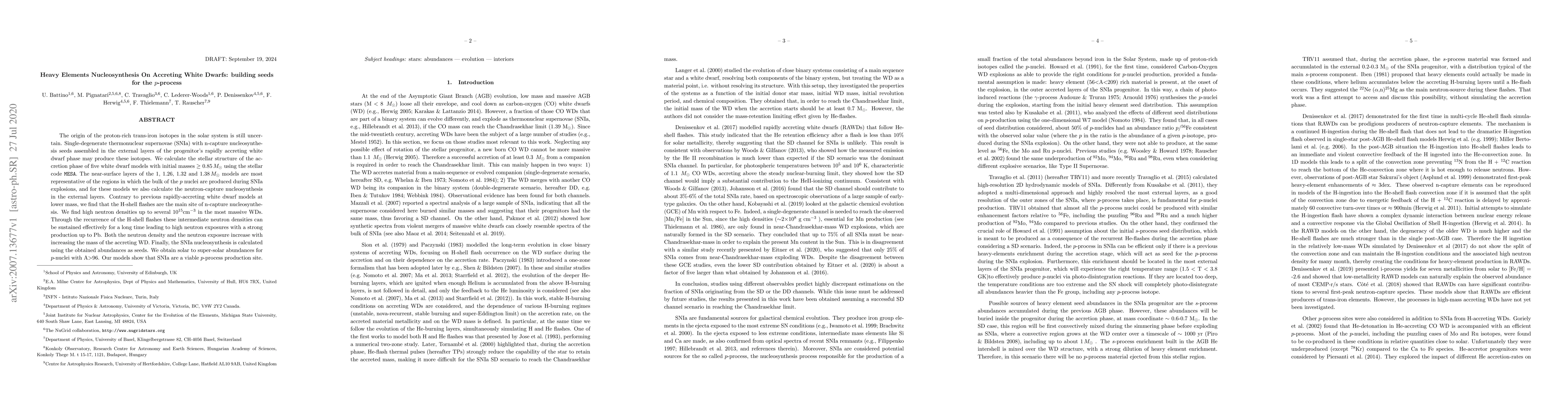 The origin of the proton-rich trans-iron isotopes in the solar system is still uncertain. Single-degenerate thermonuclear supernovae (SNIa) with n-capture nucleosynthesis seeds assembled in the external layers of the progenitor's rapidly accreting white dwarf phase may produce these isotopes. We calculate the stellar structure of the accretion phase of five white dwarf models with initial masses >~ 0.85Msun using the stellar code MESA. The near-surface layers of the 1, 1.26, 1.32 and 1.38Msun models are most representative of the regions in which the bulk of the p nuclei are produced during SNIa explosions, and for these models we also calculate the neutron-capture nucleosynthesis in the external layers. Contrary to previous rapidly-accreting white dwarf models at lower mass, we find that the H-shell ashes are the main site of n-capture nucleosynthesis. We find high neutron densities up to several 10^15 cm^-3 in the most massive WDs. Through the recurrence of the H-shell ashes these intermediate neutron densities can be sustained effectively for a long time leading to high neutron exposures with a strong production up to Pb. Both the neutron density and the neutron exposure increase with increasing the mass of the accreting WD. Finally, the SNIa nucleosynthesis is calculated using the obtained abundances as seeds. We obtain solar to super-solar abundances for p-nuclei with A>96. Our models show that SNIa are a viable p-process production site.