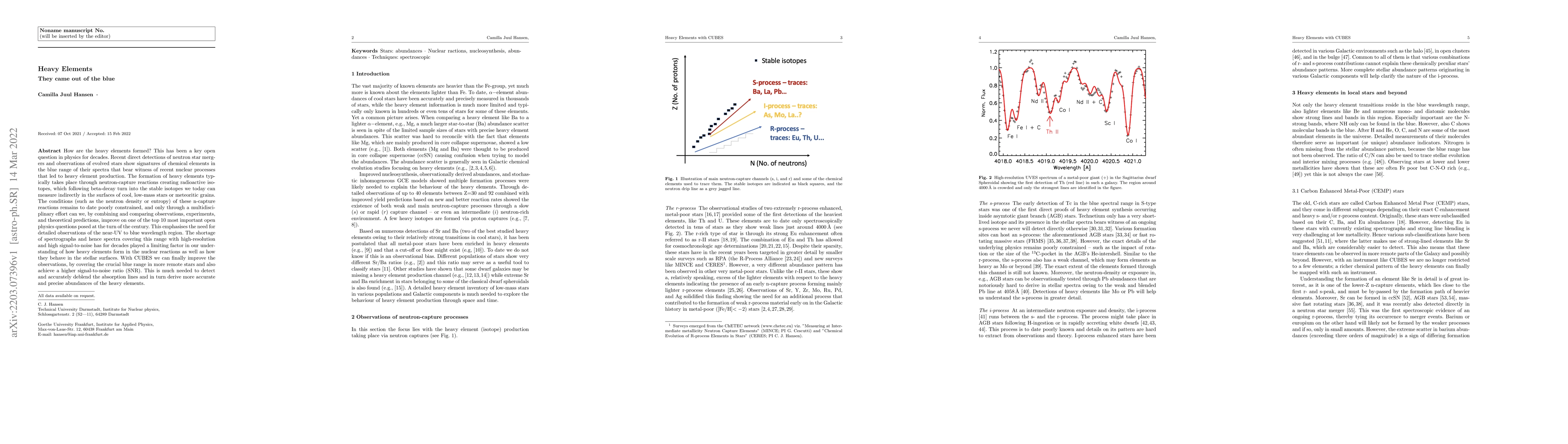 The paper discusses the formation of heavy elements, a long-standing physics question. It highlights recent progress from neutron star merger detections and evolved star observations, pointing to nuclear processes creating heavy elements via neutron-capture reactions. The study emphasizes the need for detailed observations in the near-UV to blue wavelength range, which have been limited by a lack of high-resolution, high-signal-to-noise spectrographs. The new CUBES instrument aims to enhance observations, enabling more accurate detection and deblending of heavy element absorption lines, thereby improving our understanding of their formation and behavior.