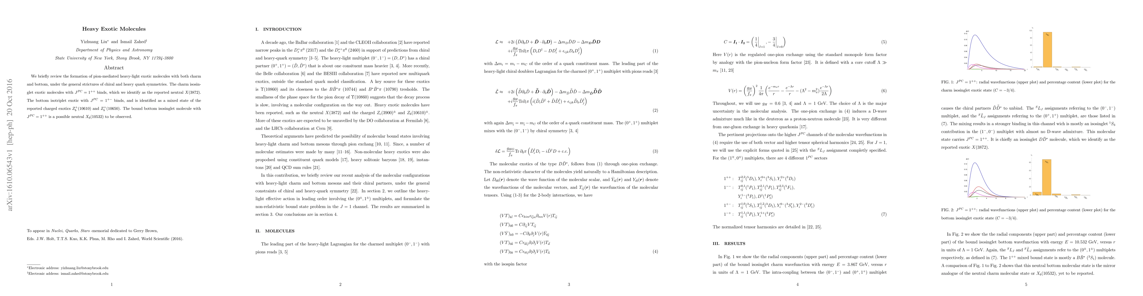 We briefly review the formation of pion-mediated heavy-light exotic molecules with both charm and bottom, under the general strictures of chiral and heavy quark symmetries. The charm isosinglet exotic molecules with $J^{PC}=1^{++}$ binds, which we identify as the reported neutral $X(3872)$. The bottom isotriplet exotic with $J^{PC}=1^{+-}$ binds, and is identified as a mixed state of the reported charged exotics $Z^+_b(10610)$ and $Z^+_b(10650)$. The bound bottom isosinglet molecule with $J^{PC}=1^{++}$ is a possible neutral $X_b(10532)$ to be observed.
