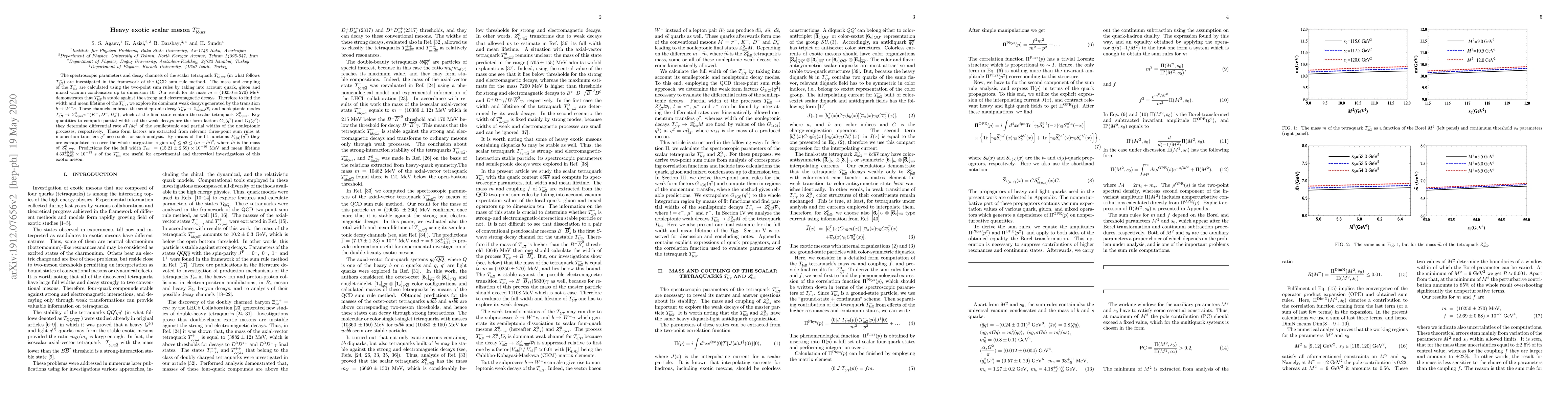 This paper investigates the spectroscopic parameters and decay channels of the exotic scalar tetraquark $T_{b:\overline{s}}^{-}$. The mass is calculated to be $m=(10250 \pm 270)~\mathrm{MeV}$, and it is found to be stable against strong and electromagnetic decays, leading to the study of its dominant weak decays, which predict a full width of $\Gamma_{\mathrm{full}}=(15.21\pm 2.59)\times 10^{-10}~\mathrm{MeV}$ and a mean lifetime of $4.33_{-0.63}^{+0.89}\times 10^{-13}~\mathrm{s}$.