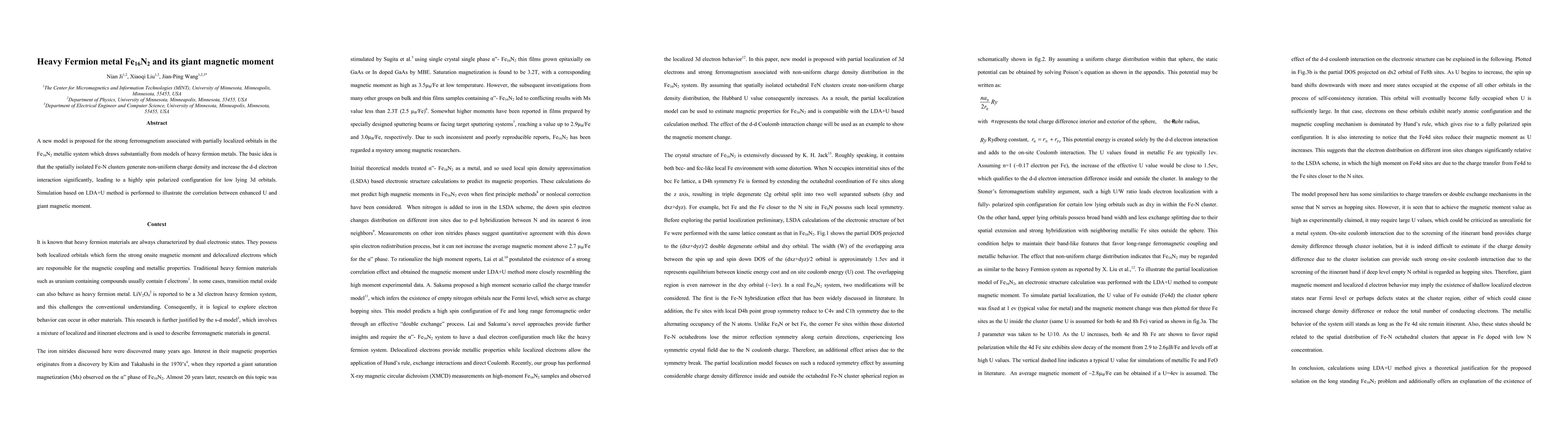 The paper proposes a model for the ferromagnetism in Fe16N2, attributing it to spatially isolated Fe-N clusters that increase d-d electron interaction, resulting in a spin-polarized configuration. Simulations using the LDA+U method demonstrate a correlation between enhanced U and the resulting giant magnetic moment.