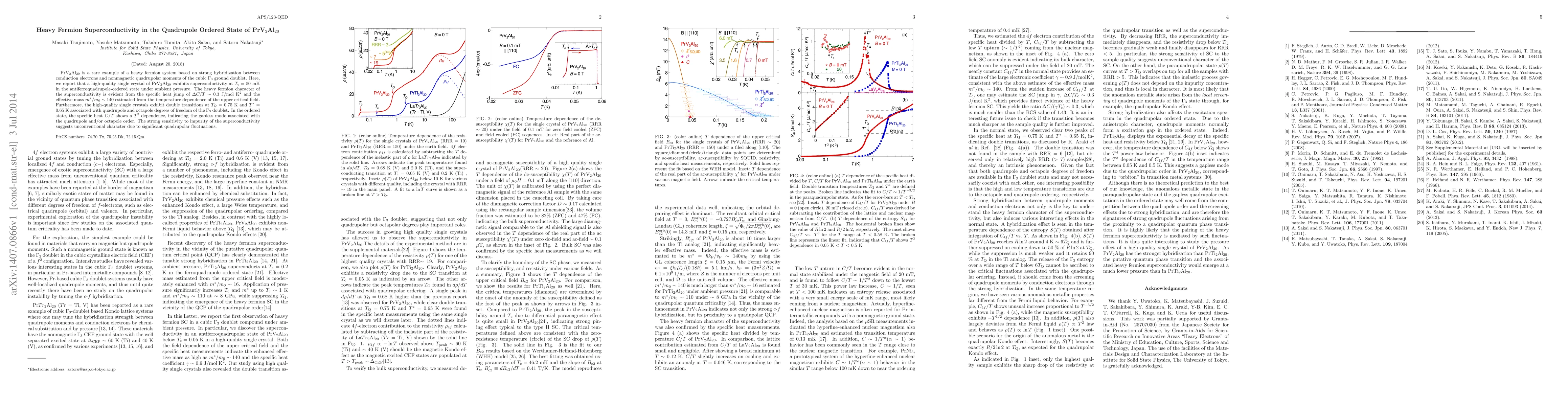 PrV$_2$Al$_{20}$ demonstrates superconductivity at 50 mK in an antiferroquadrupole-ordered state, showcasing heavy fermion characteristics with a large effective mass and specific heat jump. The superconductivity is unconventional, influenced significantly by quadrupolar fluctuations.