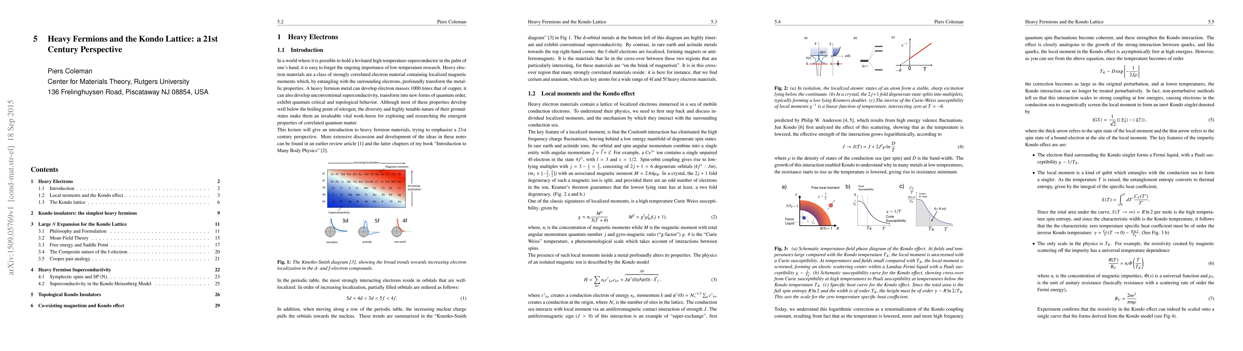 Summary: This paper provides an overview of heavy fermion physics, focusing on the Kondo effect, Kondo insulators, large N expansion, superconductivity approaches, topological Kondo insulators, and the interplay between magnetism and the Kondo effect, highlighting modern research trends.