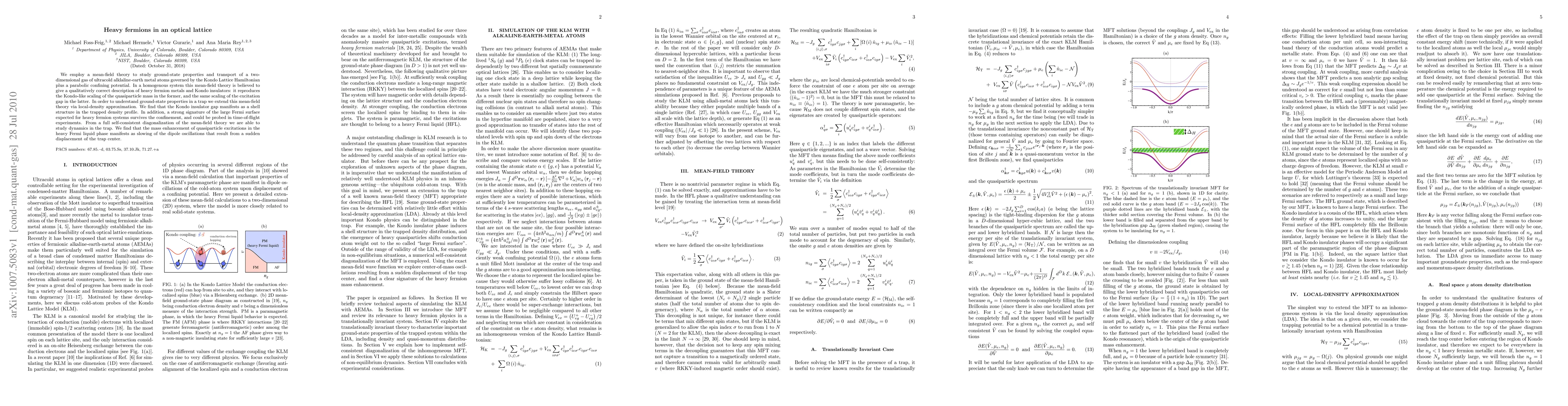 We employ a mean-field theory to study ground-state properties and transport of a two-dimensional gas of ultracold alklaline-earth metal atoms governed by the Kondo Lattice Hamiltonian plus a parabolic confining potential. In a homogenous system this mean-field theory is believed to give a qualitatively correct description of heavy fermion metals and Kondo insulators: it reproduces the Kondo-like scaling of the quasiparticle mass in the former, and the same scaling of the excitation gap in the latter. In order to understand ground-state properties in a trap we extend this mean-field theory via local-density approximation. We find that the Kondo insulator gap manifests as a shell structure in the trapped density profile. In addition, a strong signature of the large Fermi surface expected for heavy fermion systems survives the confinement, and could be probed in time-of-flight experiments. From a full self-consistent diagonalization of the mean-field theory we are able to study dynamics in the trap. We find that the mass enhancement of quasiparticle excitations in the heavy Fermi liquid phase manifests as slowing of the dipole oscillations that result from a sudden displacement of the trap center.