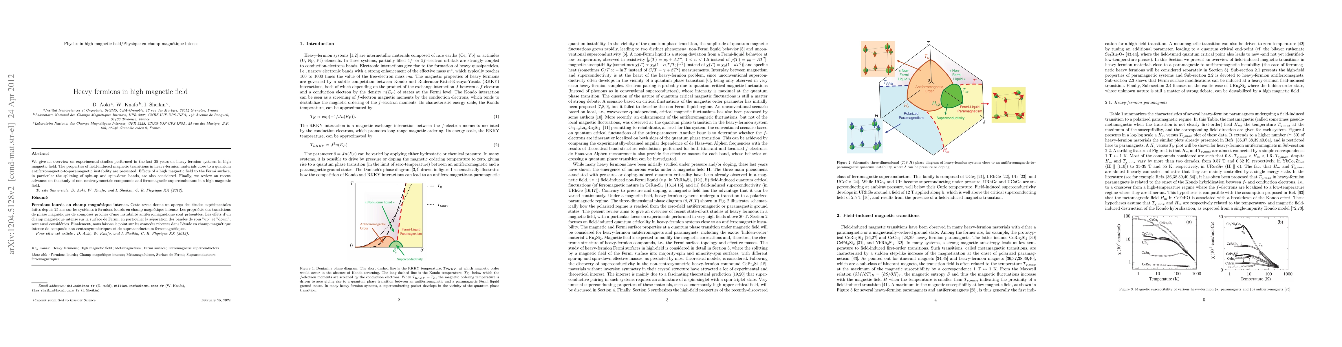 We give an overview on experimental studies performed in the last 25 years on heavy-fermion systems in high magnetic field. The properties of field-induced magnetic transitions in heavy-fermion materials close to a quantum antiferromagnetic-to-paramagnetic instability are presented. Effects of a high magnetic field to the Fermi surface, in particular the splitting of spin-up and spin-down bands, are also considered. Finally, we review on recent advances on the study of non-centrosymmetric compounds and ferromagnetic superconductors in a high magnetic field.