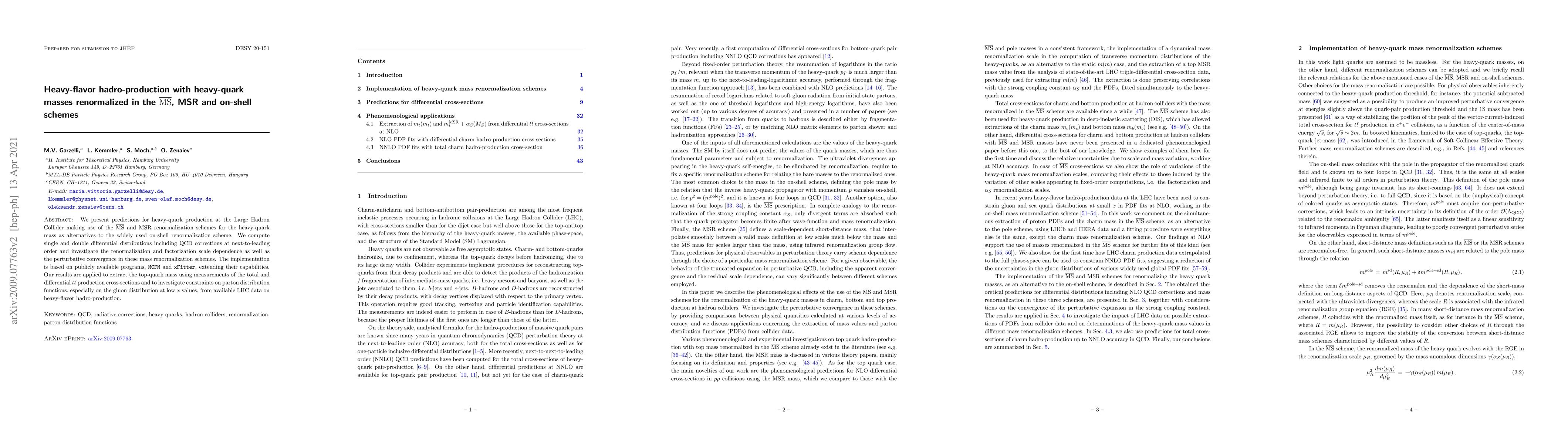 We present predictions for heavy-quark production at the Large Hadron Collider making use of the ${\overline{\rm MS}}$ and MSR renormalization schemes for the heavy-quark mass as alternatives to the widely used on-shell renormalization scheme. We compute single and double differential distributions including QCD corrections at next-to-leading order and investigate the renormalization and factorization scale dependence as well as the perturbative convergence in these mass renormalization schemes. The implementation is based on publicly available programs, ${\texttt{MCFM}}$ and ${\texttt{xFitter}}$, extending their capabilities. Our results are applied to extract the top-quark mass using measurements of the total and differential $t\bar{t}$ production cross-sections and to investigate constraints on parton distribution functions, especially on the gluon distribution at low $x$ values, from available LHC data on heavy-flavor hadro-production.