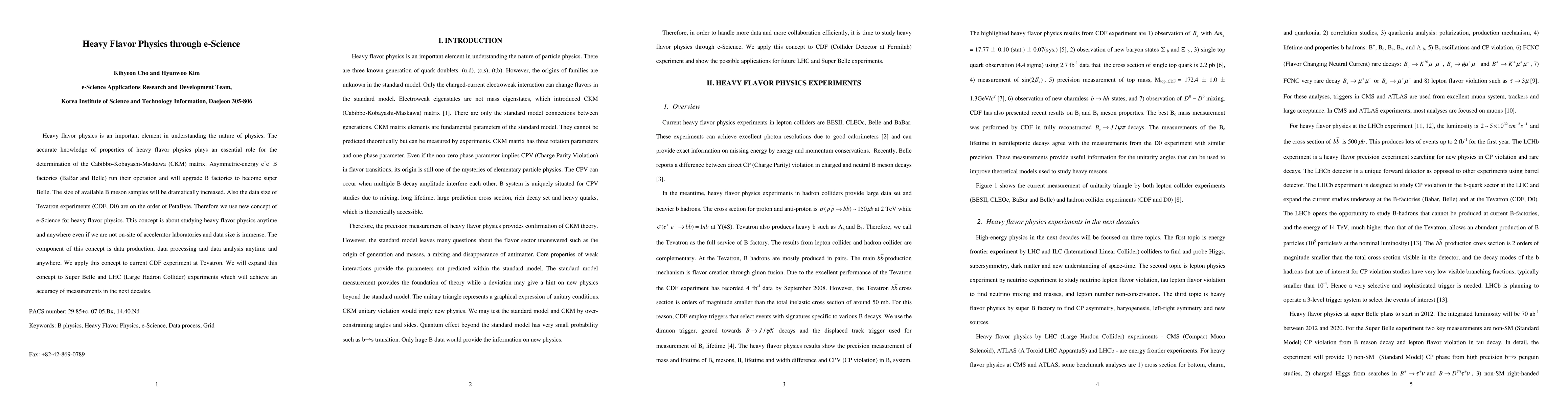 Heavy flavor physics is an important element in understanding the nature of physics. The accurate knowledge of properties of heavy flavor physics plays an essential role for the determination of the Cabibbo-Kobayashi-Maskawa (CKM) matrix. Asymmetric-energy e+e- B factories (BaBar and Belle) run their operation and will upgrade B factories to become super Belle. The size of available B meson samples will be dramatically increased. Also the data size of Tevatron experiments (CDF, D0) are on the order of PetaByte. Therefore we use new concept of e-Science for heavy flavor physics. This concept is about studying heavy flavor physics anytime and anywhere even if we are not on-site of accelerator laboratories and data size is immense. The component of this concept is data production, data processing and data analysis anytime and anywhere. We apply this concept to current CDF experiment at Tevatron. We will expand this concept to Super Belle and LHC (Large Hadron Collider) experiments which will achieve an accuracy of measurements in the next decades.
