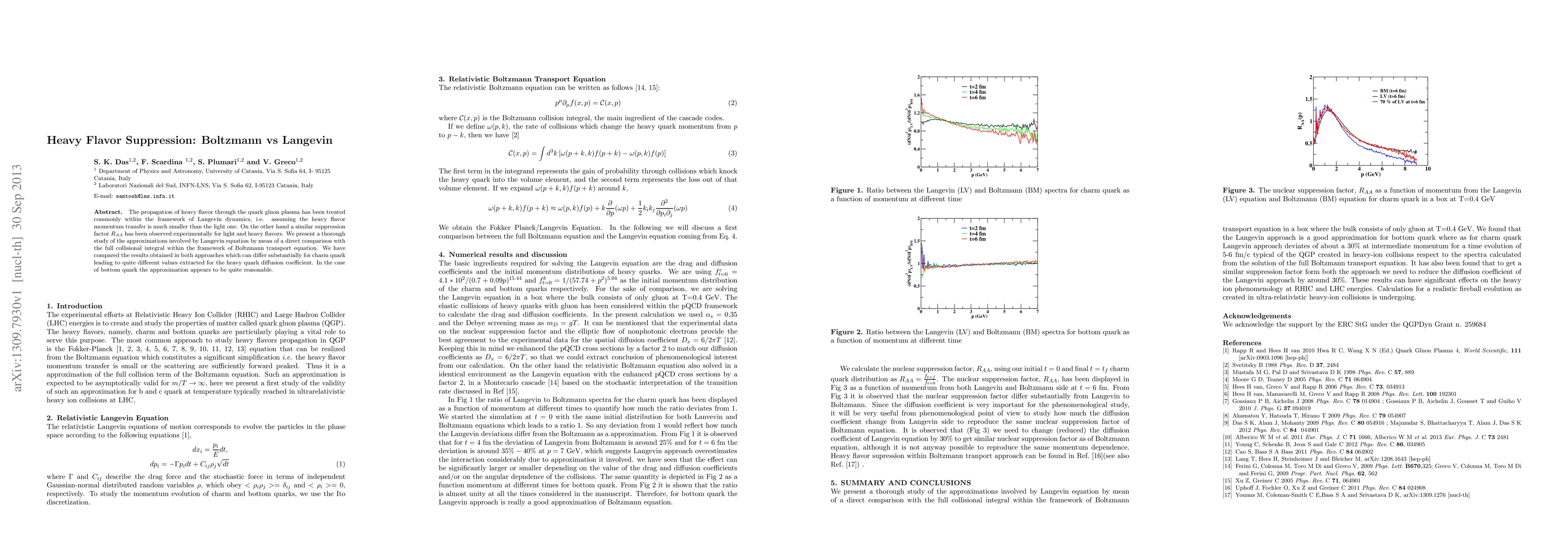 This paper compares the heavy flavor suppression in quark gluon plasma using Langevin dynamics versus the full Boltzmann transport equation, finding significant differences in charm quark diffusion coefficients but reasonable approximations for bottom quarks.