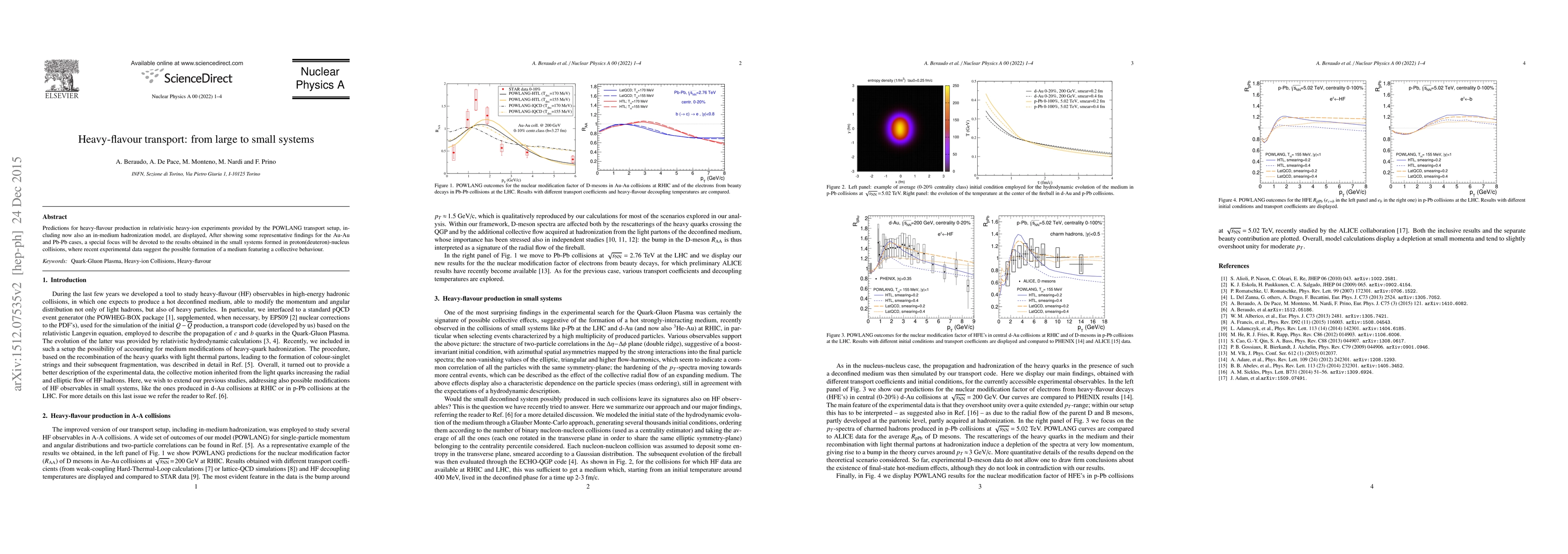 Predictions for heavy-flavour production in relativistic heavy-ion experiments provided by the POWLANG transport setup, including now also an in-medium hadronization model, are displayed, After showing some representative findings for the Au-Au and Pb-Pb cases, a special focus will be devoted to the results obtained in the small systems formed in proton(deuteron)-nucleus collisions, where recent experimental data suggest the possible formation of a medium featuring a collective behaviour.