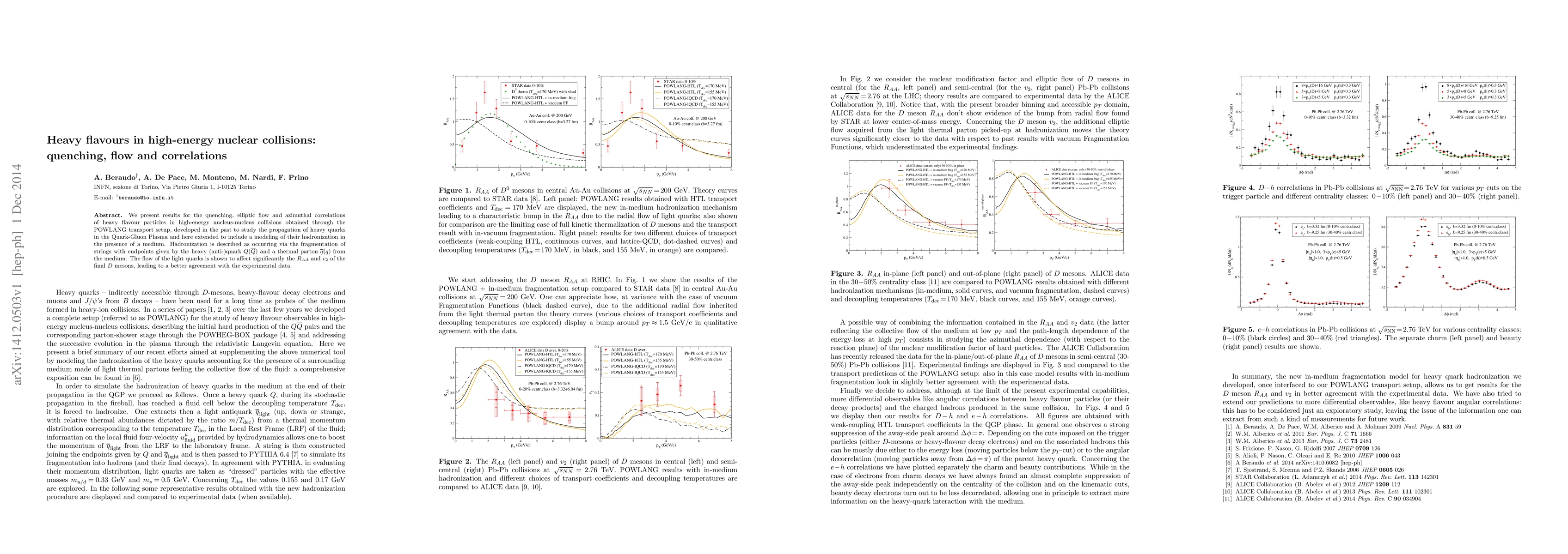 We present results for the quenching, elliptic flow and azimuthal correlations of heavy flavour particles in high-energy nucleus-nucleus collisions obtained through the POWLANG transport setup, developed in the past to study the propagation of heavy quarks in the Quark-Gluon Plasma and here extended to include a modeling of their hadronization in the presence of a medium. Hadronization is described as occurring via the fragmentation of strings with endpoints given by the heavy (anti-)quark Q(Qbar) and a thermal parton $qbar(q)$ from the medium. The flow of the light quarks is shown to affect significantly the R_AA} and v_2 of the final D mesons, leading to a better agreement with the experimental data.
