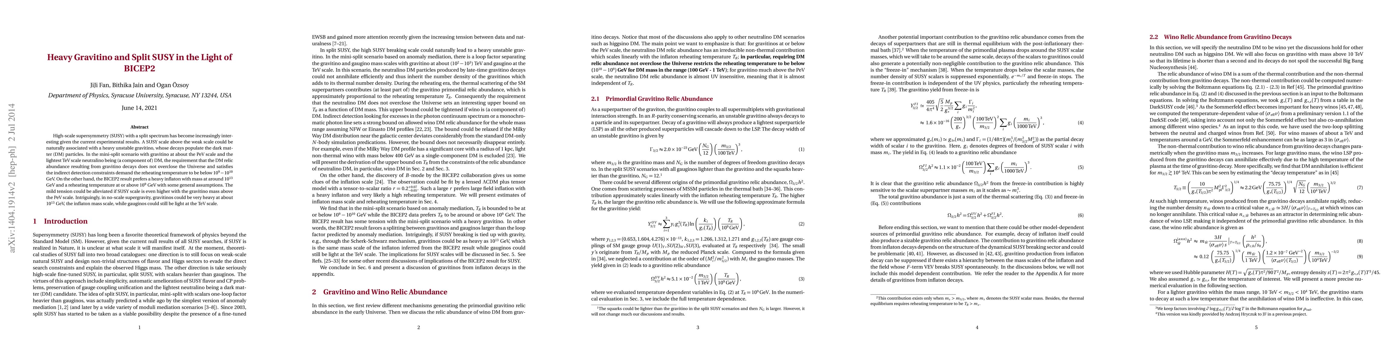 This paper explores high-scale split supersymmetry (SUSY) where a heavy gravitino could naturally populate dark matter, aligning with BICEP2's inflationary constraints. It suggests that a gravitino mass above the PeV scale could reconcile the BICEP2 preferred inflaton mass and reheating temperature with the DM relic abundance and indirect detection constraints.