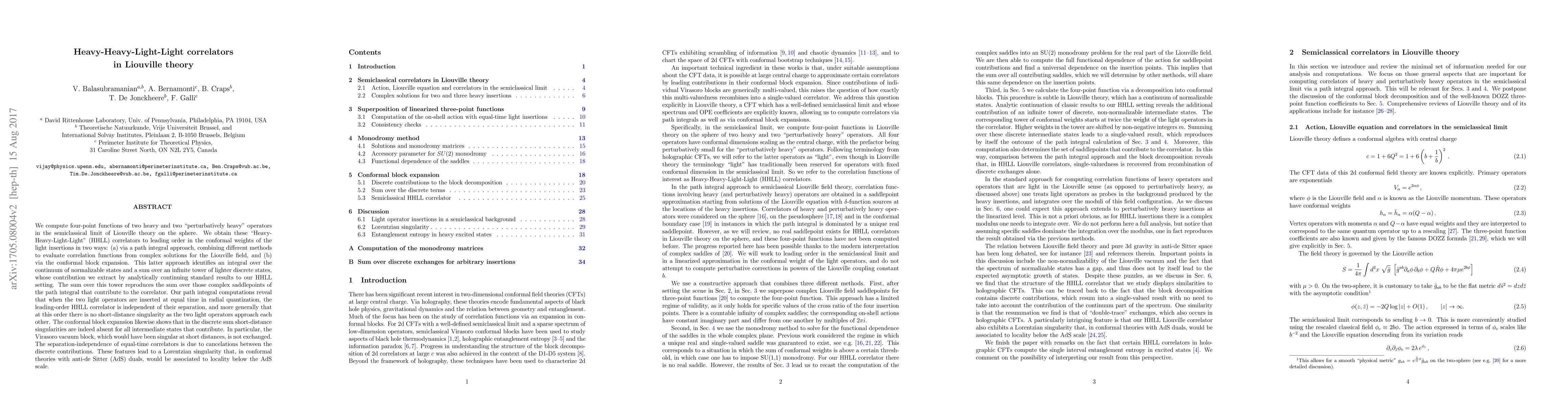 We compute four-point functions of two heavy and two "perturbatively heavy" operators in the semiclassical limit of Liouville theory on the sphere. We obtain these "Heavy-Heavy-Light-Light" (HHLL) correlators to leading order in the conformal weights of the light insertions in two ways: (a) via a path integral approach, combining different methods to evaluate correlation functions from complex solutions for the Liouville field, and (b) via the conformal block expansion. This latter approach identifies an integral over the continuum of normalizable states and a sum over an infinite tower of lighter discrete states, whose contribution we extract by analytically continuing standard results to our HHLL setting. The sum over this tower reproduces the sum over those complex saddlepoints of the path integral that contribute to the correlator. Our path integral computations reveal that when the two light operators are inserted at equal time in radial quantization, the leading-order HHLL correlator is independent of their separation, and more generally that at this order there is no short-distance singularity as the two light operators approach each other. The conformal block expansion likewise shows that in the discrete sum short-distance singularities are indeed absent for all intermediate states that contribute. In particular, the Virasoro vacuum block, which would have been singular at short distances, is not exchanged. The separation-independence of equal-time correlators is due to cancelations between the discrete contributions. These features lead to a Lorentzian singularity that, in conformal theories with anti-de Sitter (AdS) duals, would be associated to locality below the AdS scale.