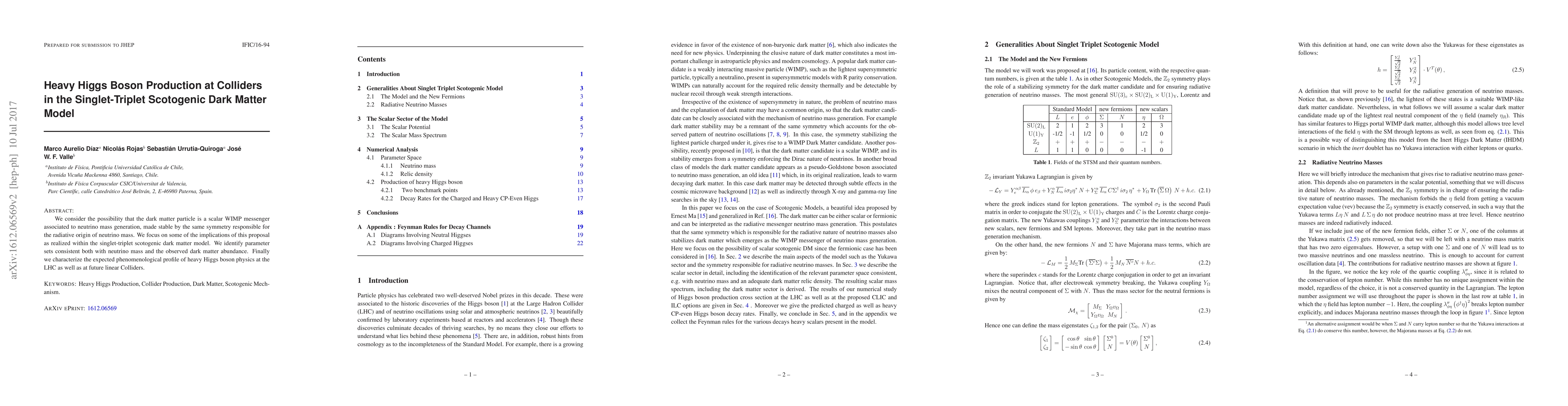 We consider the possibility that the dark matter particle is a scalar WIMP messenger associated to neutrino mass generation, made stable by the same symmetry responsible for the radiative origin of neutrino mass. We focus on some of the implications of this proposal as realized within the singlet-triplet scotogenic dark matter model.We identify consistent parameter sets consistent both with neutrino mass and the observed dark matter abundance. Finally we characterize the expected phenomenological profile of heavy Higgs boson physics at the LHC as well as at future linear Colliders.