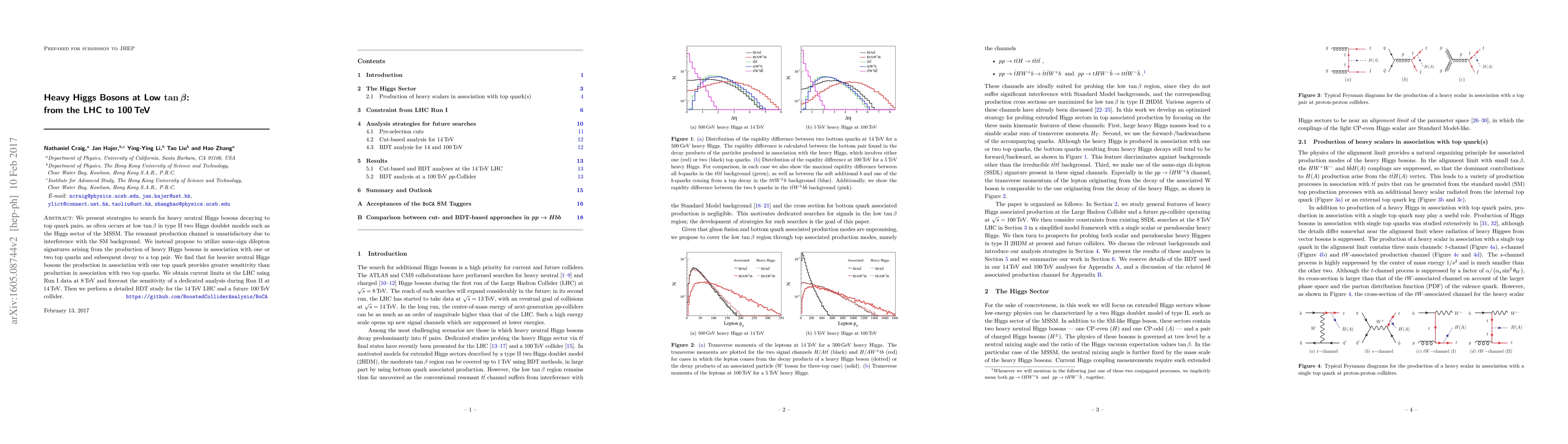 This paper explores strategies to detect heavy neutral Higgs bosons in type II two Higgs doublet models, focusing on low $\tan \beta$ scenarios. It proposes using same-sign dilepton signatures from associated production with top quarks, finding greater sensitivity in this channel than resonant production. The study assesses current LHC limits and forecasts future sensitivities at higher energies.
