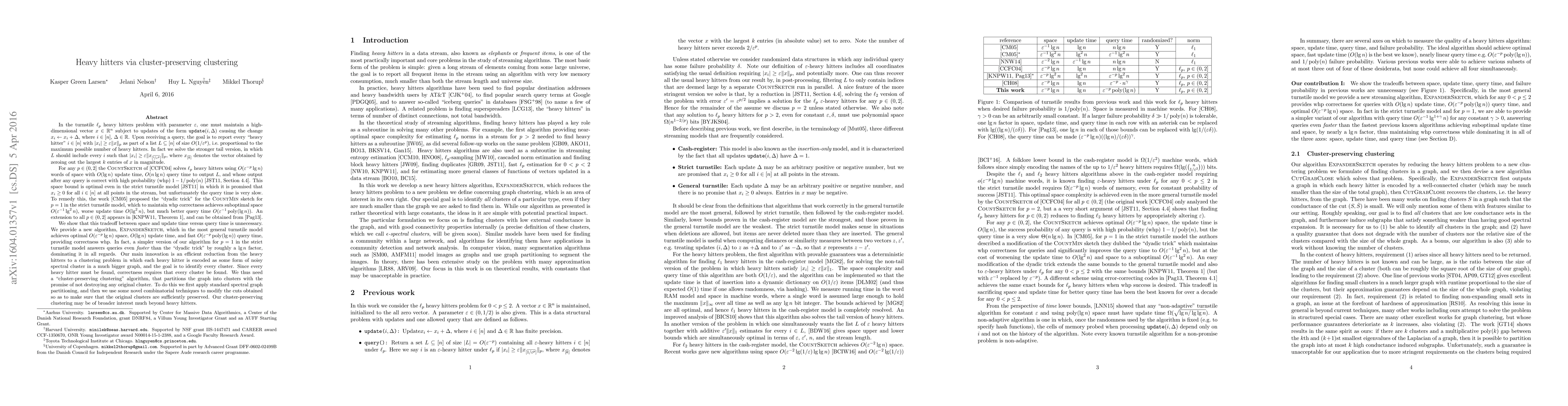 The paper proposes a new algorithm, ExpanderSketch, to efficiently identify $\ell_p$ $\varepsilon$-heavy hitters in high-dimensional data streams. It achieves optimal space and update time while significantly improving query time compared to previous methods. The key innovation is reducing the heavy hitters problem to a clustering problem, using a "cluster-preserving clustering" approach to identify clusters without losing any original cluster.