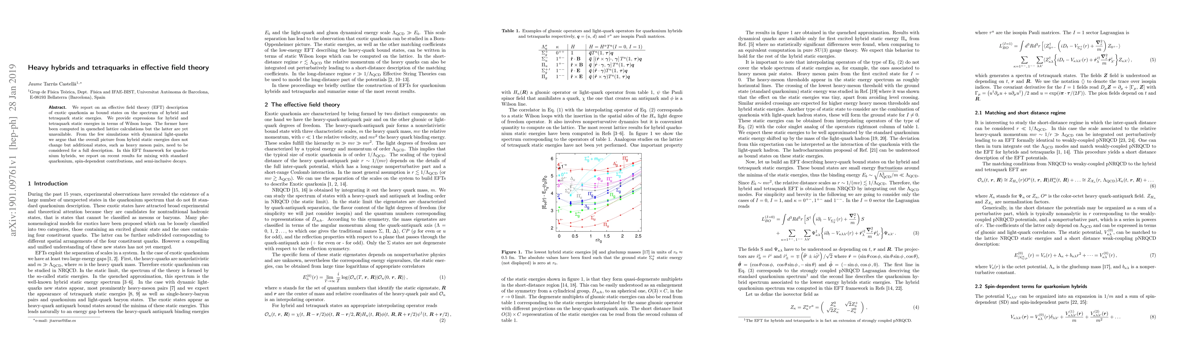 We report on an effective field theory (EFT) description of exotic quarkonia as bound states on the spectrum of hybrid and tetraquark static energies. We provide expressions for hybrid and tetraquark static energies in terms of Wilson loops. The former have been computed in quenched lattice calculations but the latter are yet unavailable. From the few simulations with dynamical light-quarks we argue that the overall picture from hybrid static energies does not change but additional states, such as heavy meson pairs, need to be considered for a full description. In this EFT framework for quarkonium hybrids, we report on recent results for mixing with standard quarkonium, spin-dependent contributions, and semi-inclusive decays.