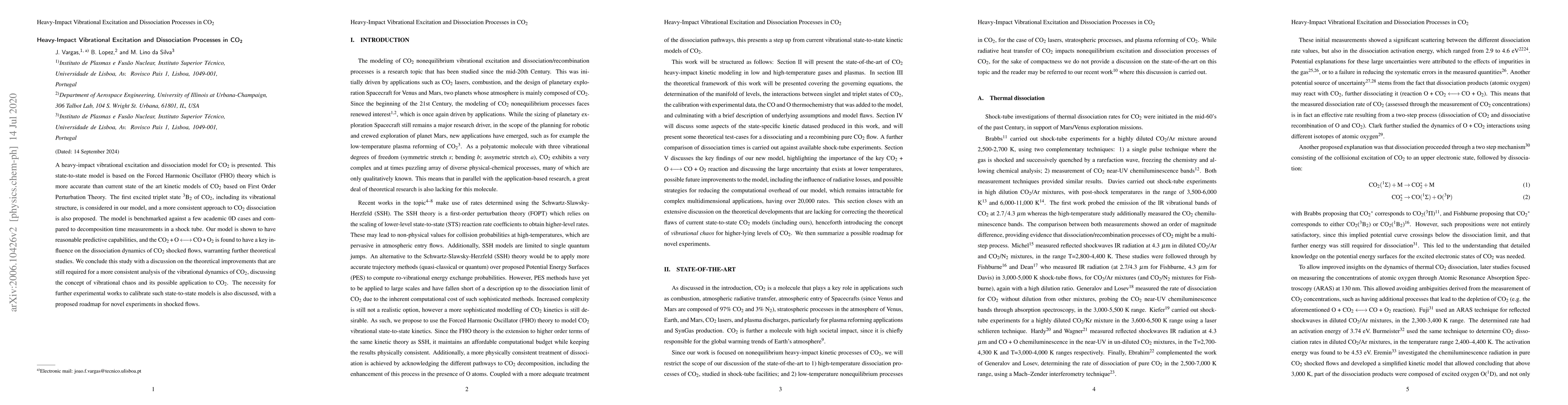 A heavy-impact vibrational excitation and dissociation model for CO$_2$ is presented. This state-to-state model is based on the Forced Harmonic Oscillator (FHO) theory which is more accurate than current state of the art kinetic models of CO$_2$ based on First Order Perturbation Theory. The first excited triplet state $^{3}$B$_{2}$ of CO$_2$, including its vibrational structure, is considered in our model, and a more consistent approach to CO$_2$ dissociation is also proposed. The model is benchmarked against a few academic 0D cases and compared to decomposition time measurements in a shock tube. Our model is shown to have reasonable predictive capabilities, and the CO$_2$ $+$ O $\leftrightarrow$ CO $+$ O$_2$ is found to have a key influence on the dissociation dynamics of CO$_2$ shocked flows, warranting further theoretical studies. We conclude this study with a discussion on the theoretical improvements that are still required for a more consistent analysis of the vibrational dynamics of CO$_2$, discussing the concept of vibrational chaos and its possible application to CO$_2$. The necessity for further experimental works to calibrate such state-to-state models is also discussed, with a proposed roadmap for novel experiments in shocked flows.
