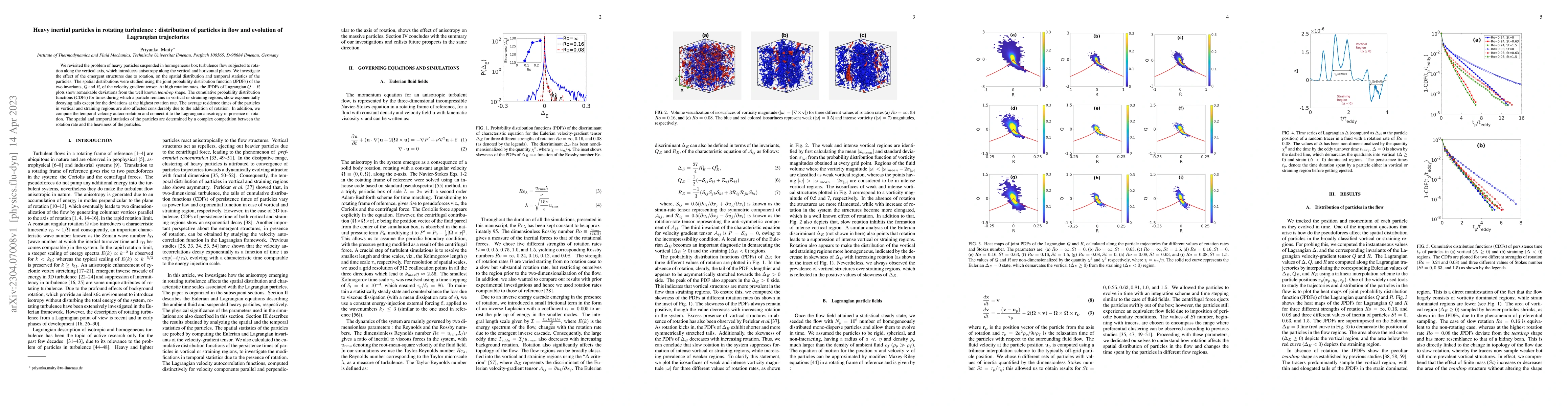 This paper examines the behavior of heavy inertial particles in rotating turbulence, focusing on their distribution and Lagrangian trajectories. It finds that high rotation rates significantly alter the spatial distribution and temporal statistics of particles, deviating from typical teardrop shapes and showing exponential decay in cumulative probability distributions.