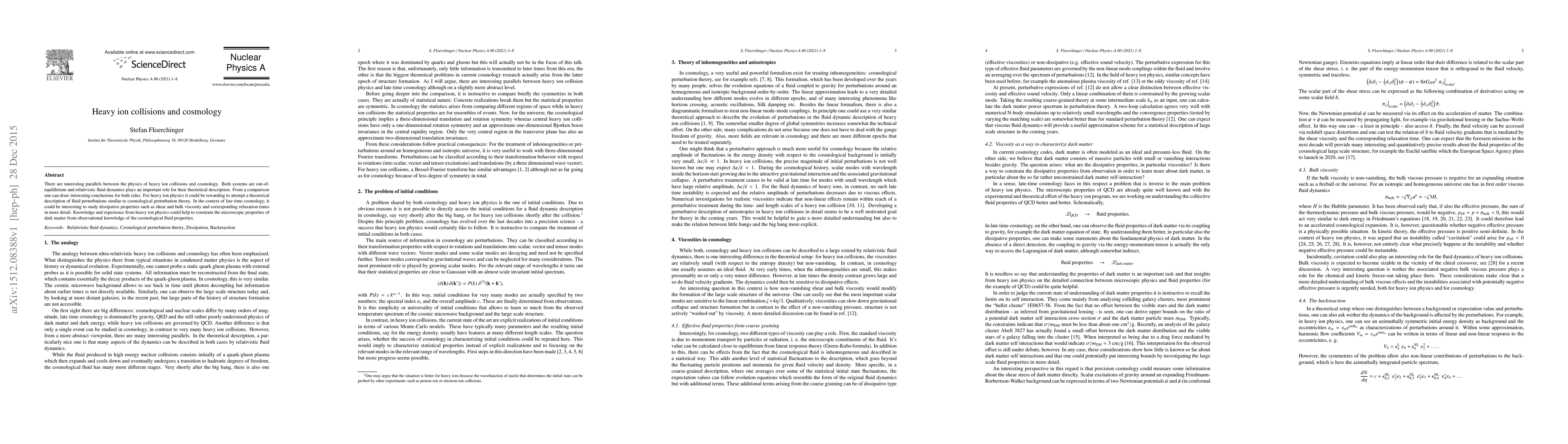 There are interesting parallels between the physics of heavy ion collisions and cosmology. Both systems are out-of-equilibrium and relativistic fluid dynamics plays an important role for their theoretical description. From a comparison one can draw interesting conclusions for both sides. For heavy ion physics it could be rewarding to attempt a theoretical description of fluid perturbations similar to cosmological perturbation theory. In the context of late time cosmology, it could be interesting to study dissipative properties such as shear and bulk viscosity and corresponding relaxation times in more detail. Knowledge and experience from heavy ion physics could help to constrain the microscopic properties of dark matter from observational knowledge of the cosmological fluid properties.