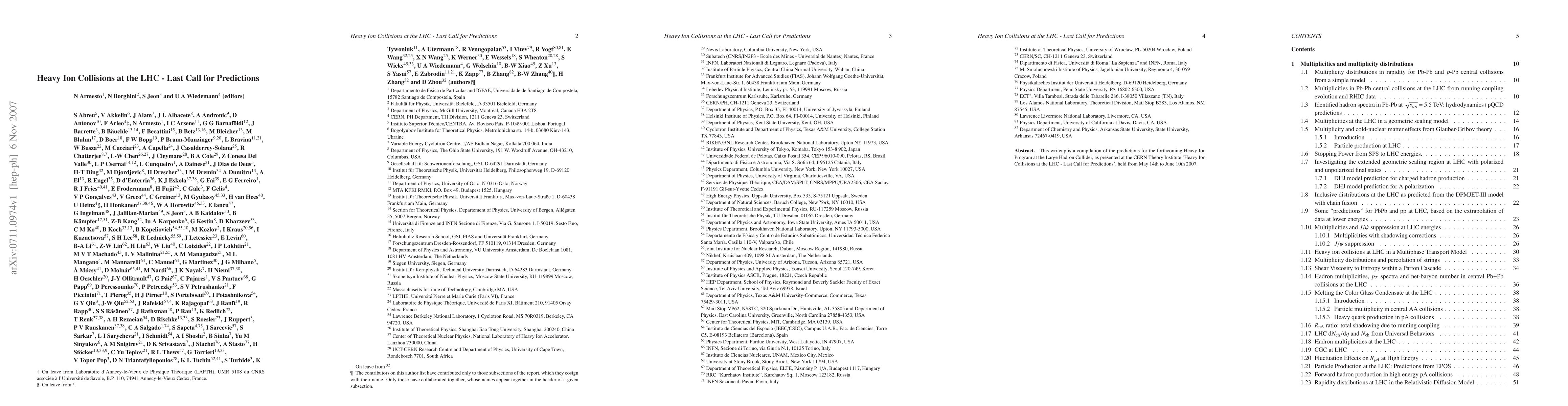 This paper compiles theoretical predictions for the upcoming Heavy Ion Program at the LHC, presented at the CERN Theory Institute's symposium held from May 14th to June 10th, 2007. It aims to provide a comprehensive overview of anticipated outcomes for these collisions.