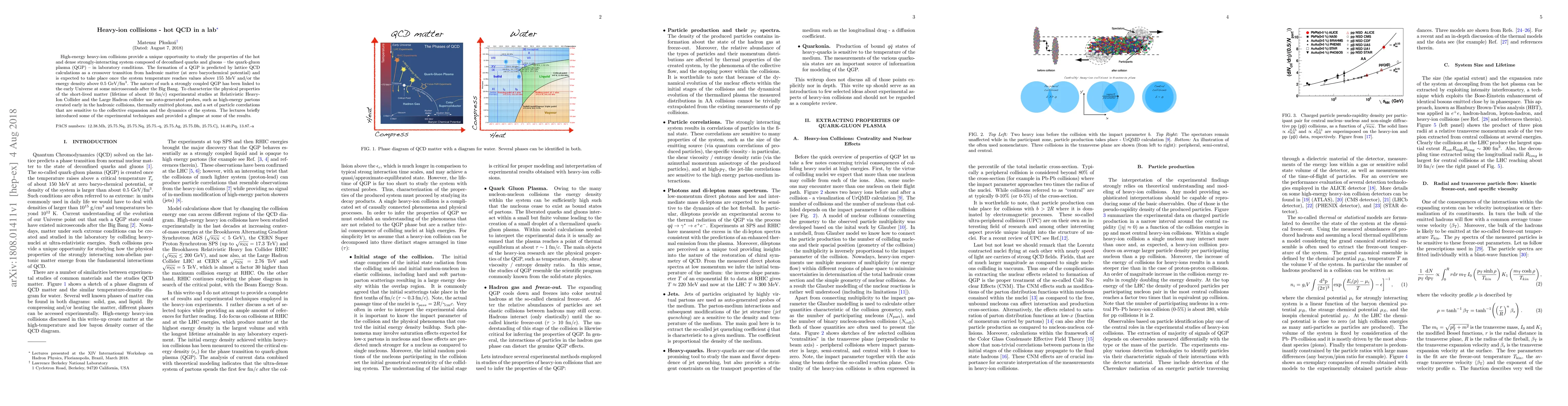 High-energy heavy-ion collisions provide a unique opportunity to study the properties of the hot and dense strongly-interacting system composed of deconfined quarks and gluons -- the quark-gluon plasma (QGP) -- in laboratory conditions. The formation of a QGP is predicted by lattice QCD calculations as a crossover transition from hadronic matter (at zero baryochemical potential) and is expected to take place once the system temperature reaches values above 155 MeV and/or the energy density above $0.5~\mathrm{GeV}/\mathrm{fm}^{3}$. The nature of such a strongly coupled QGP has been linked to the early Universe at some microseconds after the Big Bang. To characterize the physical properties of the short-lived matter (lifetime of about $10~\mathrm{fm}/c$) experimental studies at Relativistic Heavy-Ion Collider and the Large Hadron collider use auto-generated probes, such as high-energy partons created early in the hadronic collisions, thermally emitted photons, and a set of particle correlations that are sensitive to the collective expansion and the dynamics of the system. The lectures briefly introduced some of the experimental techniques and provided a glimpse at some of the results.