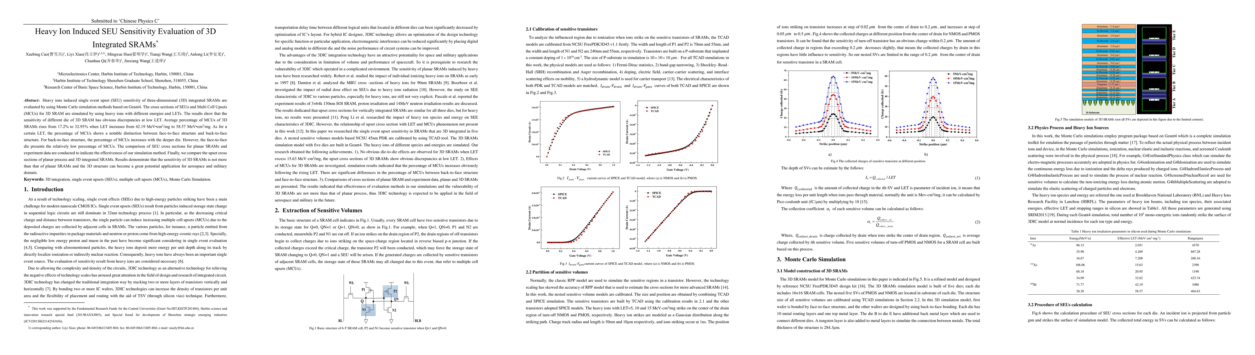 Heavy ions induced single event upset (SEU) sensitivity of three-dimensional integrated SRAMs are evaluated by using Monte Carlo sumulation methods based on Geant4. The cross sections of SEUs and Multi Cell Upsets (MCUs) for 3D SRAM are simulated by using heavy ions with different energies and LETs. The results show that the sensitivity of different die of 3D SRAM has obvious discrepancies at low LET. Average percentage of MCUs of 3D SRAMs rises from 17.2% to 32.95% when LET increases from 42.19 MeV cm2/mg to 58.57MeV cm2/mg. As for a certain LET, the percentage of MCUs shows a notable distinction between face-to-face structure and back-to-face structure. For back-to-face structure, the percentage of MCUs increases with the deeper die. However, the face-to-face die presents the relatively low percentage of MCUs. The comparison of SEU cross sections for planar SRAMs and experiment data are conducted to indicate the effectiveness of our simulation method. Finally, we compare the upset cross sections of planar process and 3D integrated SRAMs. Results demonstrate that the sensitivity of 3D SRAMs is not more than that of planar SRAMs and the 3D structure can be become a great potential application for aerospace and military domain.