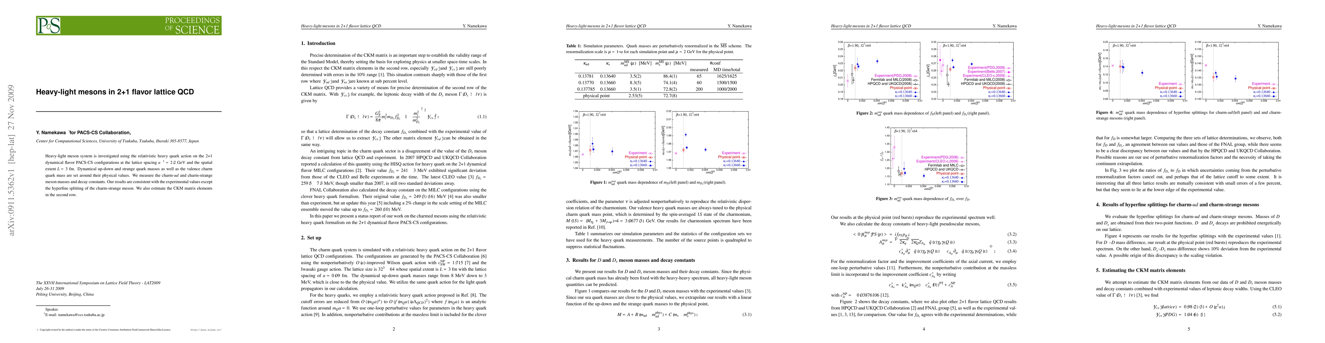 Heavy-light meson system is investigated using the relativistic heavy quark action on the 2+1 dynamical flavor PACS-CS configurations at the lattice spacing $a^{-1}=2.2$ GeV and the spatial extent L=3 fm. Dynamical up-down and strange quark masses as well as the valence charm quark mass are set around their physical values. We measure the charm-$ud$ and charm-strange meson masses and decay constants. Our results are consistent with the experimental values except the hyperfine splitting of the charm-strange meson. We also estimate the CKM matrix elements in the second row.