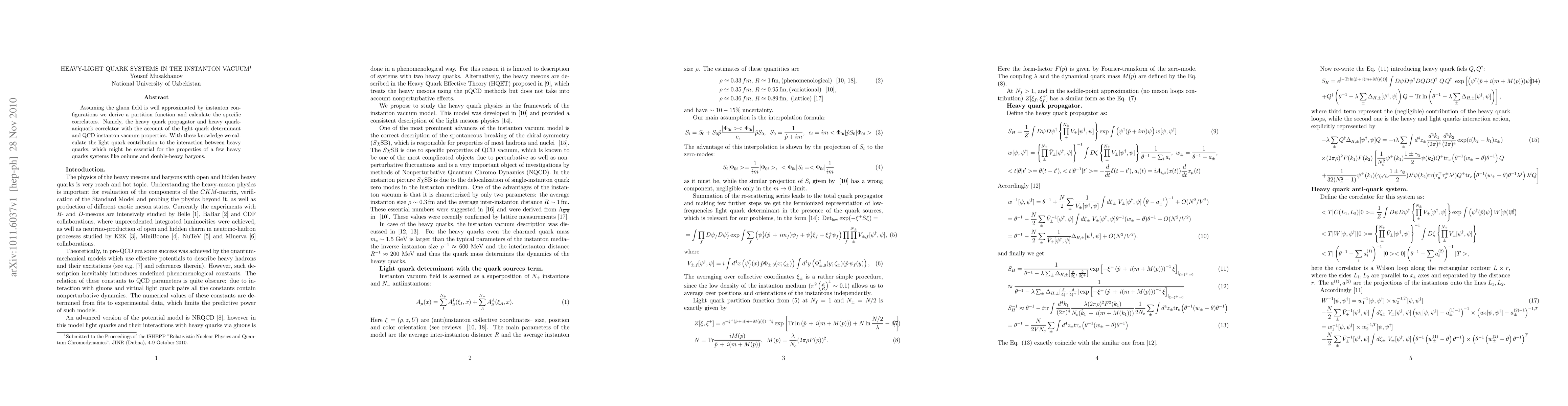 This research derives a partition function for heavy-light quark systems in an instanton vacuum, focusing on the heavy quark propagator and correlator, while accounting for light quark determinants and QCD instanton properties. It calculates the light quark's contribution to interactions between heavy quarks, crucial for understanding oniums and double-heavy baryons.