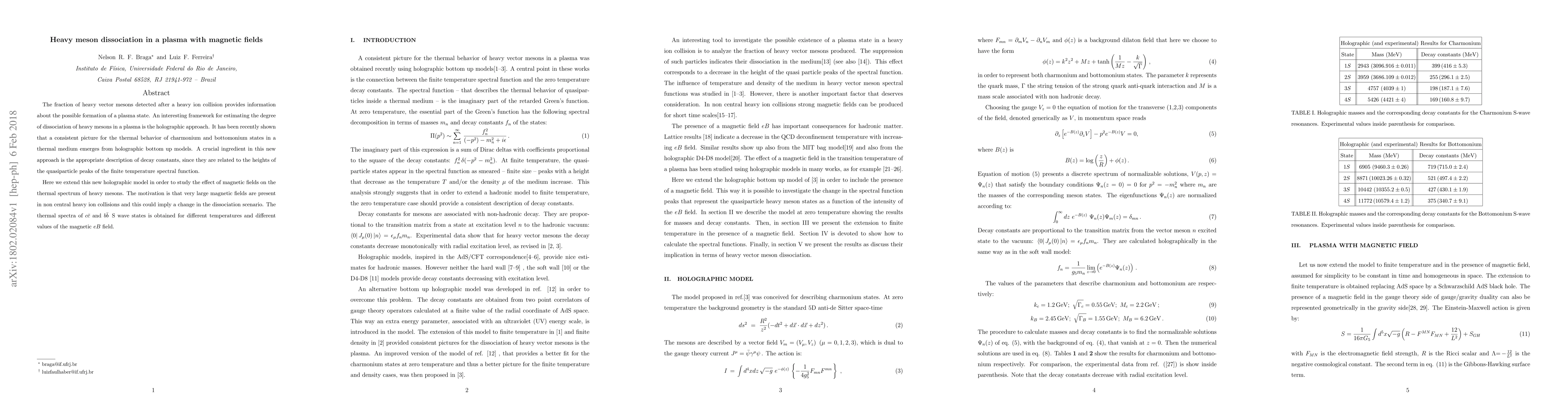 The fraction of heavy vector mesons detected after a heavy ion collision provides information about the possible formation of a plasma state. An interesting framework for estimating the degree of dissociation of heavy mesons in a plasma is the holographic approach. It has been recently shown that a consistent picture for the thermal behavior of charmonium and bottomonium states in a thermal medium emerges from holographic bottom up models. A crucial ingredient in this new approach is the appropriate description of decay constants, since they are related to the heights of the quasiparticle peaks of the finite temperature spectral function. Here we extend this new holographic model in order to study the effect of magnetic fields on the thermal spectrum of heavy mesons. The motivation is that very large magnetic fields are present in non central heavy ion collisions and this could imply a change in the dissociation scenario. The thermal spectra of $ c \bar c$ and $ b \bar b \, $ S wave states is obtained for different temperatures and different values of the magnetic $e B$ field.