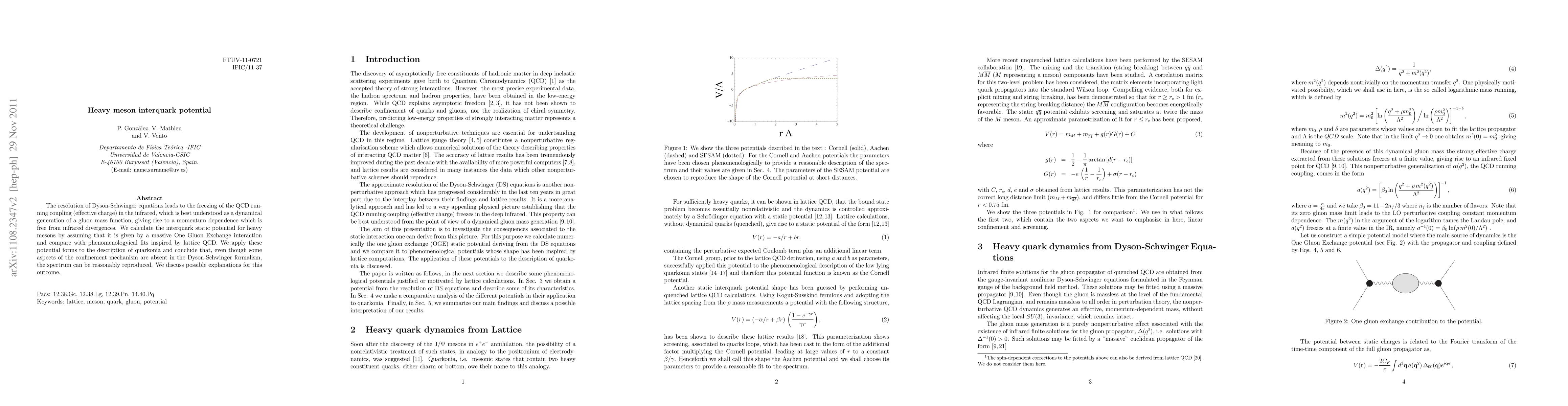 This paper resolves Dyson-Schwinger equations to show the dynamical generation of a gluon mass function, leading to a momentum-dependent infrared-free QCD running coupling. It calculates the heavy meson interquark potential using a massive One Gluon Exchange model and compares it to lattice QCD fits, finding surprisingly accurate spectral predictions despite some missing confinement aspects.