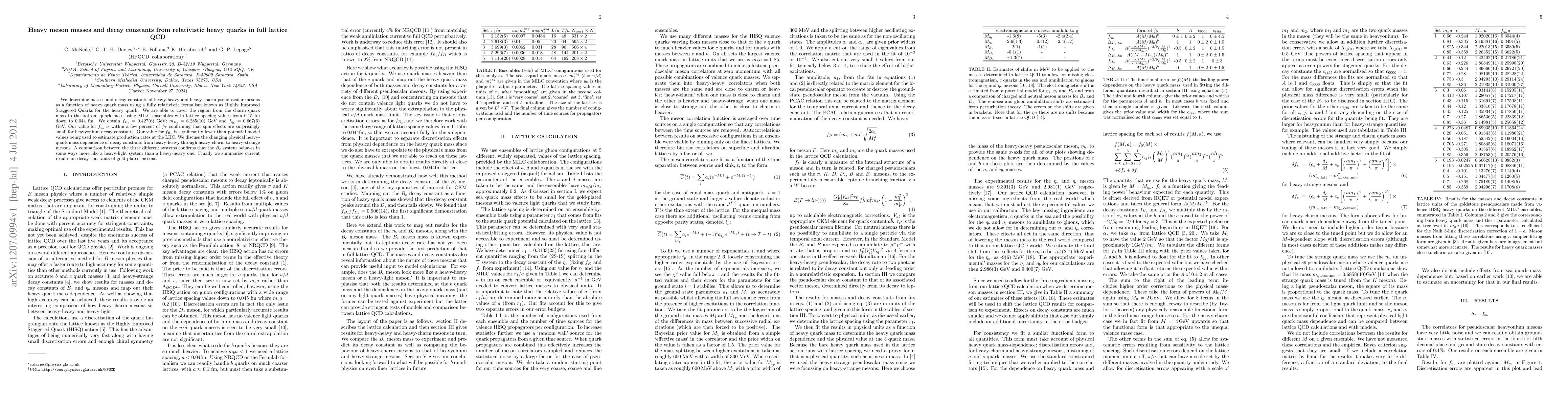 This paper determines the masses and decay constants of heavy-heavy and heavy-charm pseudoscalar mesons using relativistic heavy quarks in full lattice QCD. The study reveals that the decay constant f_{B_c} is significantly lower than potential model estimates, and f_{\eta_b} is close to f_{\Upsilon}, indicating minimal spin effects.