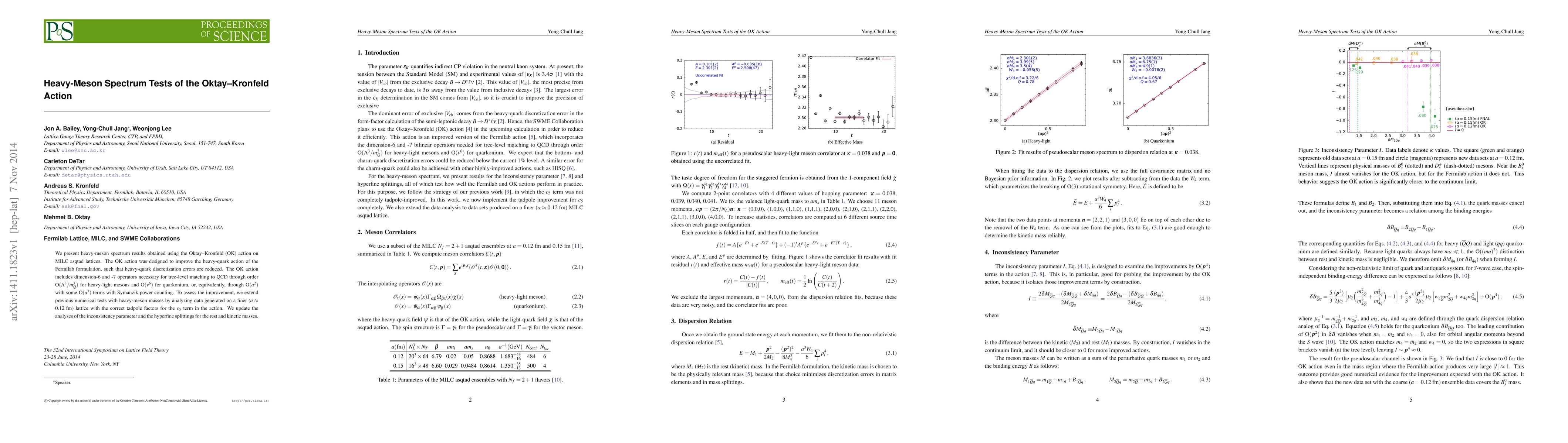 We present heavy-meson spectrum results obtained using the Oktay--Kronfeld (OK) action on MILC asqtad lattices. The OK action was designed to improve the heavy-quark action of the Fermilab formulation, such that heavy-quark discretization errors are reduced. The OK action includes dimension-6 and -7 operators necessary for tree-level matching to QCD through order $\mathrm{O}(\Lambda^3/m_Q^3)$ for heavy-light mesons and $\mathrm{O}(v^6)$ for quarkonium, or, equivalently, through $\mathrm{O}(a^2)$ with some $\mathrm{O}(a^3)$ terms with Symanzik power counting. To assess the improvement, we extend previous numerical tests with heavy-meson masses by analyzing data generated on a finer ($a \approx 0.12\;$fm) lattice with the correct tadpole factors for the $c_5$ term in the action. We update the analyses of the inconsistency parameter and the hyperfine splittings for the rest and kinetic masses.
