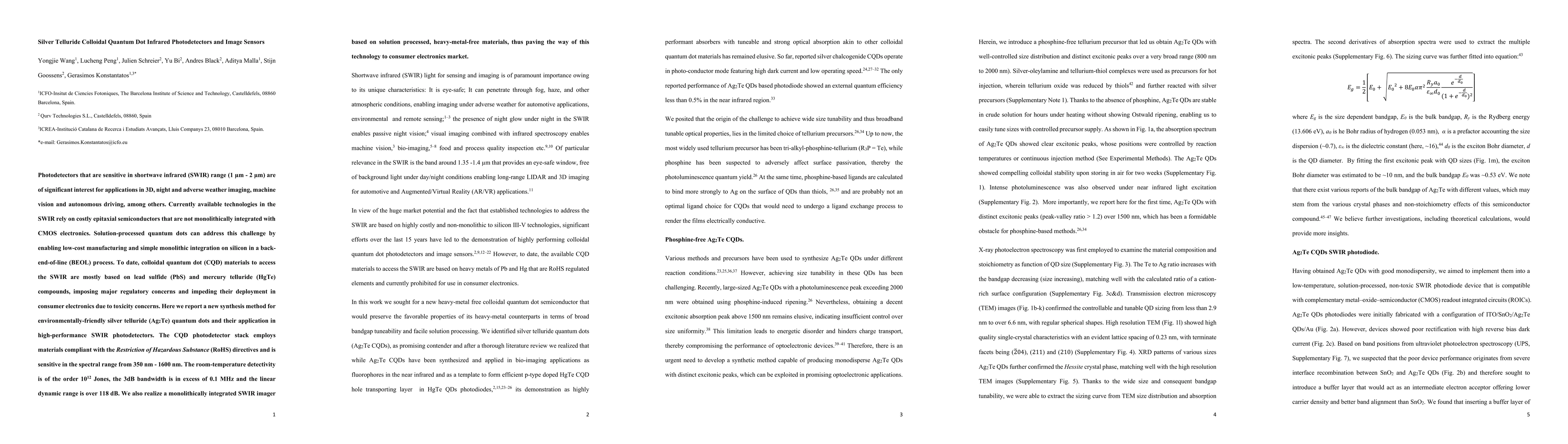 This paper presents a novel method for synthesizing environmentally friendly silver telluride quantum dots for high-performance shortwave infrared (SWIR) photodetectors, entirely compliant with RoHS regulations. The developed SWIR photodetectors and image sensors exhibit excellent performance metrics and pave the way for their integration into consumer electronics.