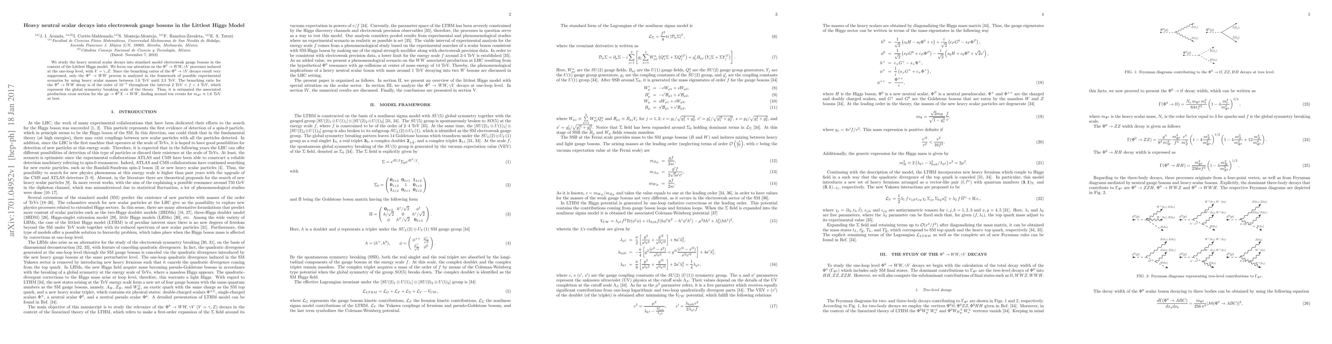 This paper investigates the decay of a heavy neutral scalar ($\Phi^0$) into electroweak gauge bosons within the Littlest Higgs model, focusing on the $\Phi^0 \to WW$ process due to suppressed $\Phi^0 \to \gamma V$ decays. The study finds a branching ratio of around $10^{-3}$ for $\Phi^0$ decays in the mass range 2 TeV to 4 TeV, predicting approximately ten events for $\Phi^0$ at 1.6 TeV.